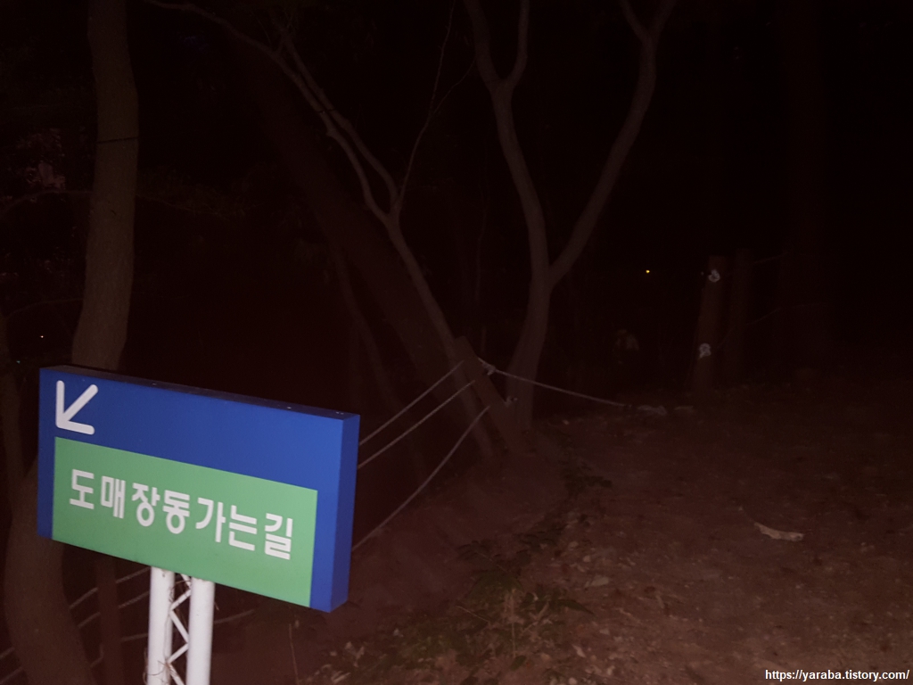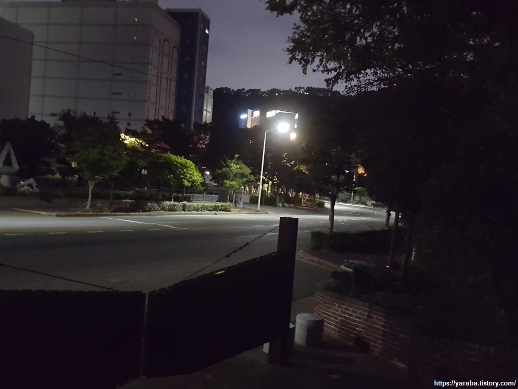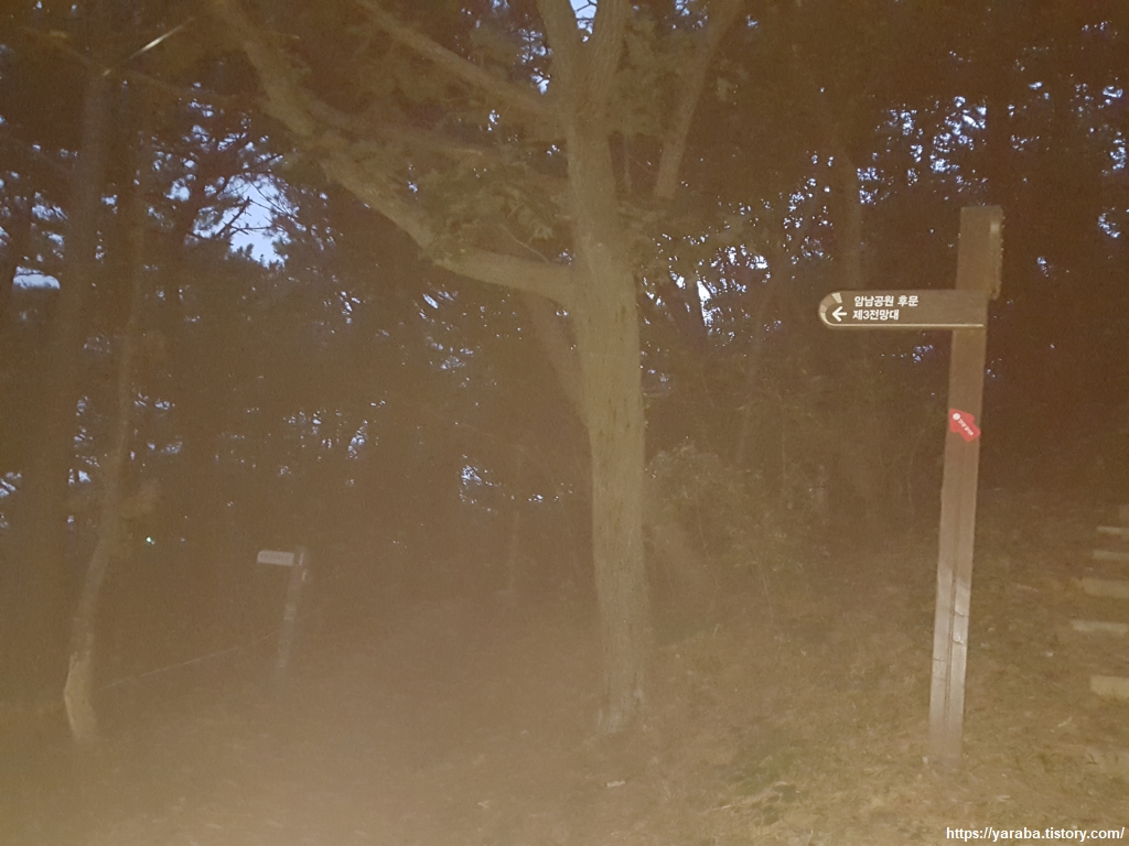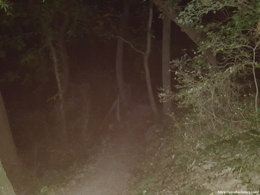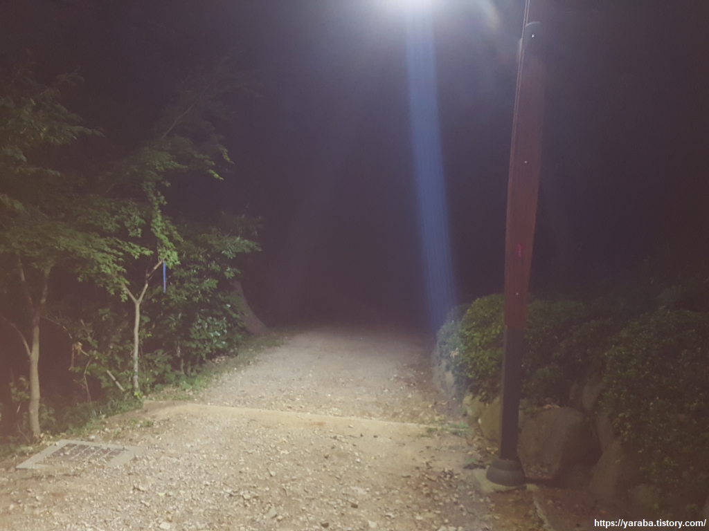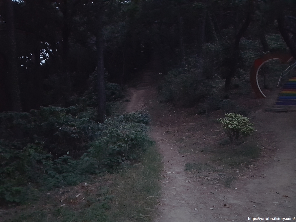 두도 전망대를 한 바퀴 돌아 다시 만난 사랑 계단. 이번에는 계단으로 가지 않고 계단 옆으로 이어진 오솔길을 통해서 공원 후문을 향해 걷는다. 점점 더 길이 잘 보이지 않기 시작한다. 조명이 없는 구간인데 플래시도 없어서 오로지 야간 시력에 의지해서 길을 이어간다.