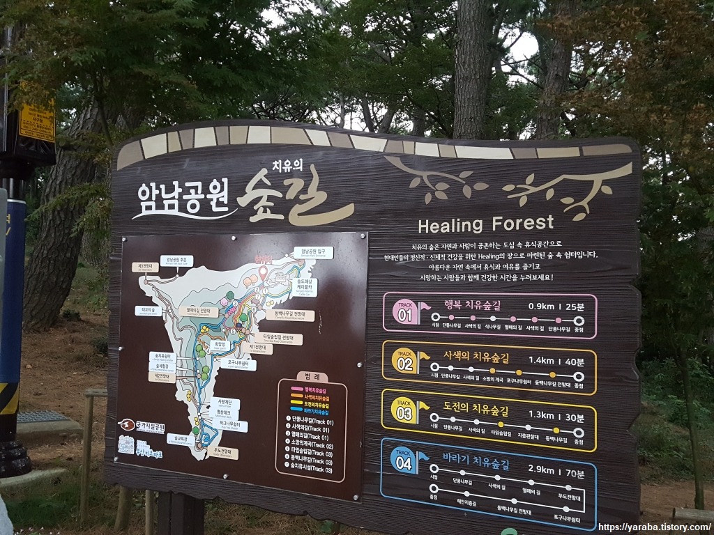 암남 공원 숲길은 여러 갈래로 준비되어 있지만 남파랑길은 스카이 파크에서 시작하여 송도 반도 끝의 두도 전망대까지 가서 길을 돌아 공원 후문으로 빠져나간다. 암남동의 암남이란 이름은 글자 그대로 해석하면 바위 남쪽이라는 의미인데 아미산 남쪽이란 의미라고 추정한다는 말이 있다.