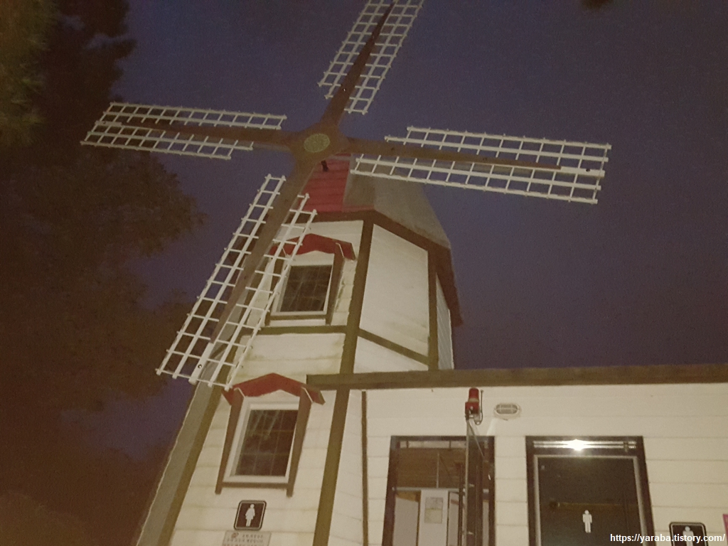 드디어 긴 어둠 끝에 가로등을 만났다. 불빛이 얼마나 반가운지, 공원 후문에 거의 다 도착한 것이다. 화장실도 풍차가 달린 럭셔리한 외관을 가지고 있었다. ㅎㅎ