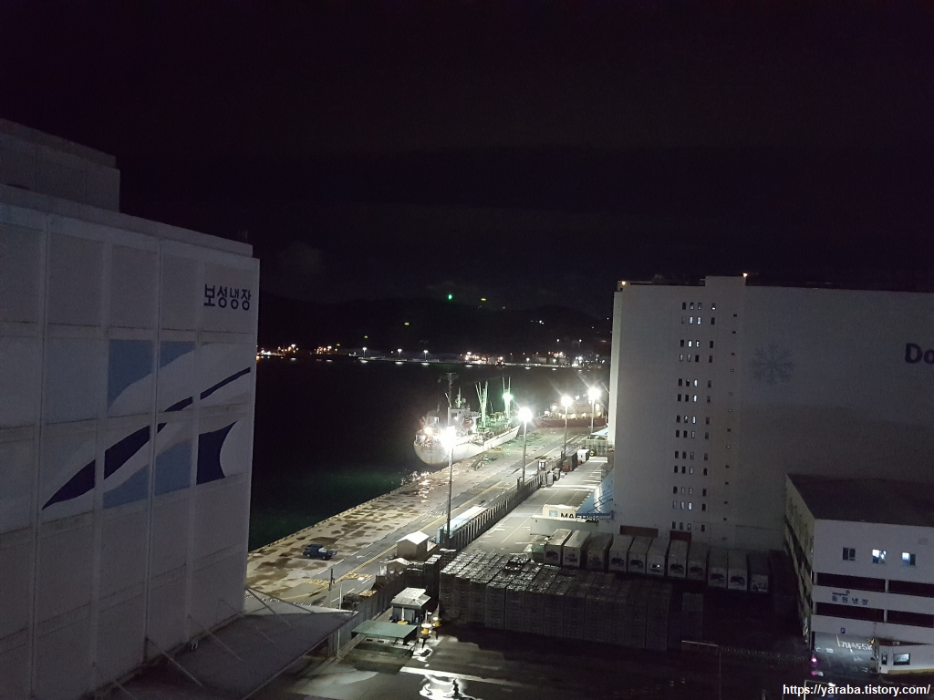 내일을 기약하면 오늘 밤은 언덕길에 있는 파인힐 모텔에서 휴식을 취한다. 숙소 창문에서 바라본 감천항 동편 부두의 모습이다. 커다란 원양 어선에서 밤샘 하역 작업을 하는 모양이다. 거대한 냉장, 냉동 창고의 모습조차 불빛에 감성을 흘리는 분위기다.