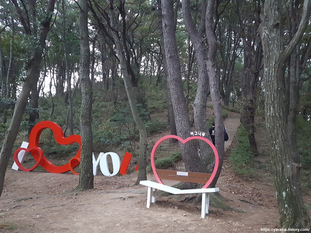 공원 외곽으로 이어지는 산책로와 만나는 삼거리를 지나면 이름하여 사랑 계단을 지난다. 나들이 나온 사람들에게 사진으로 추억을 남기도록 해주는 공간이다. 사랑 계단 아래 우측의 길은 암남 공원 후문으로 나가는 길이다. 두도 전망대를 한 바퀴 돌아 나오면 길은 사랑 계단 우측 길로 나간다.