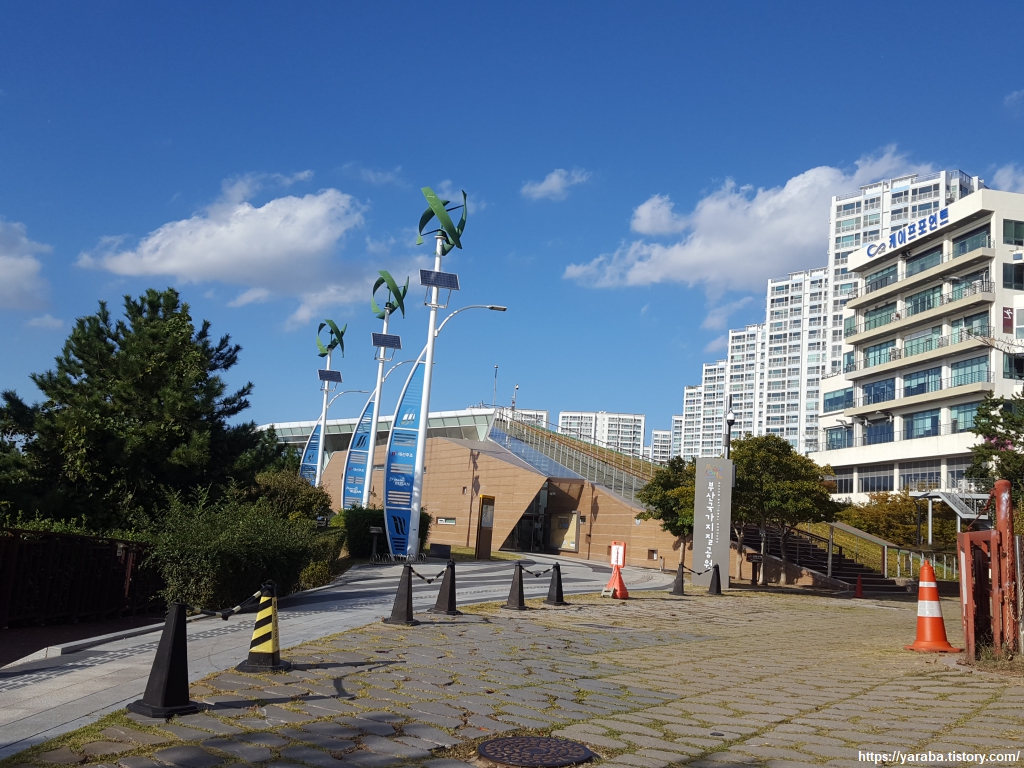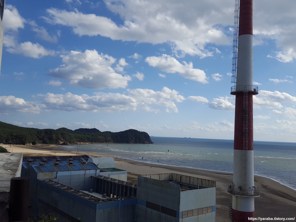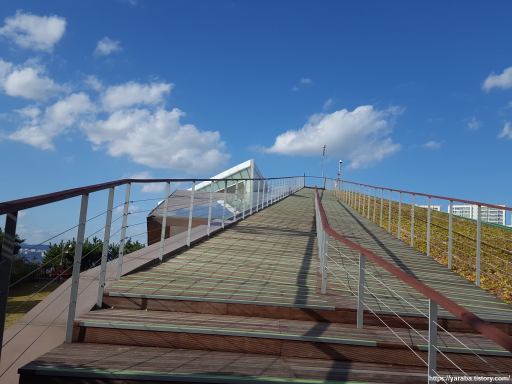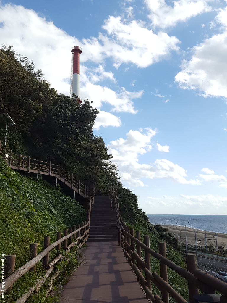 아미산 전망대로 오르는 언덕 옆으로는 지금은 사용하지 않는 다대 쓰레기 소각장의 굴뚝이 왠지 모를 감성적인 분위기를 자아낸다. 데크 계단길에서 소각장 쪽으로 바라보면 우리가 지나왔던 몰운대가 눈에 들어온다.