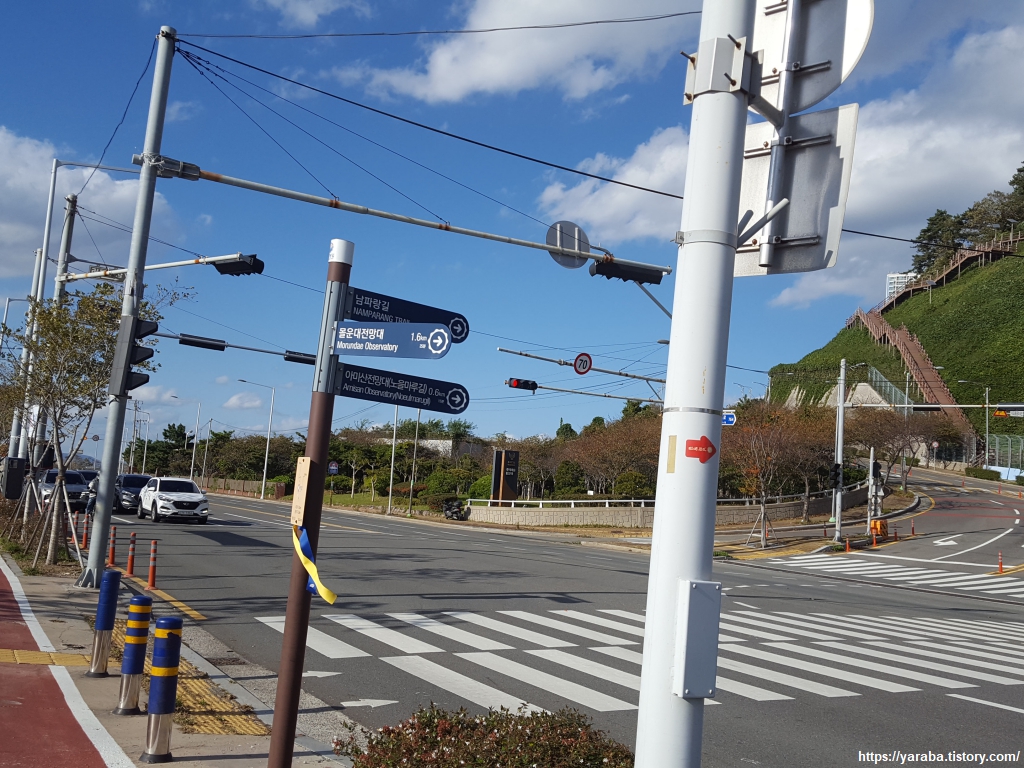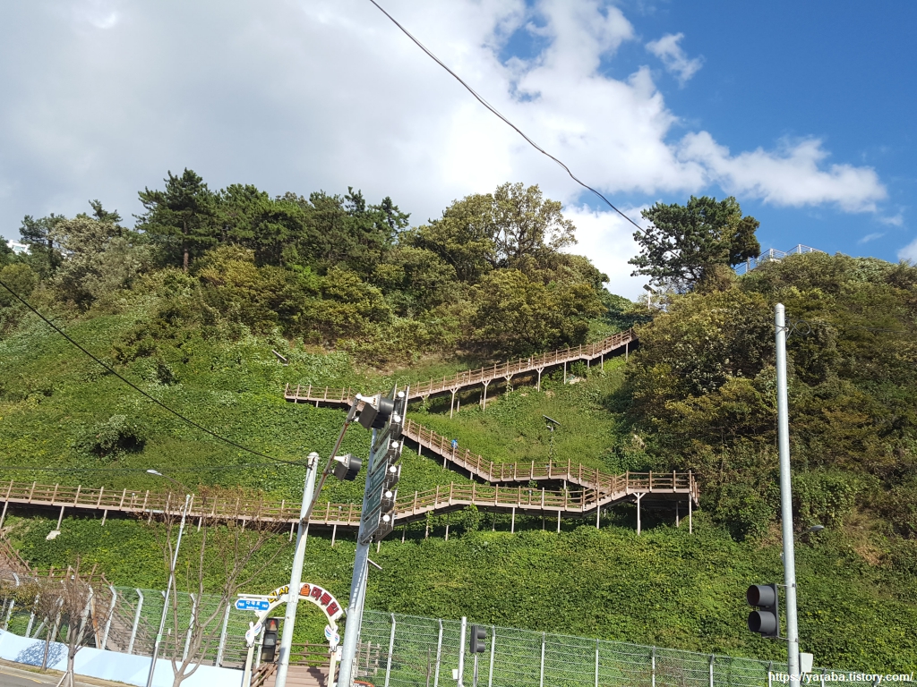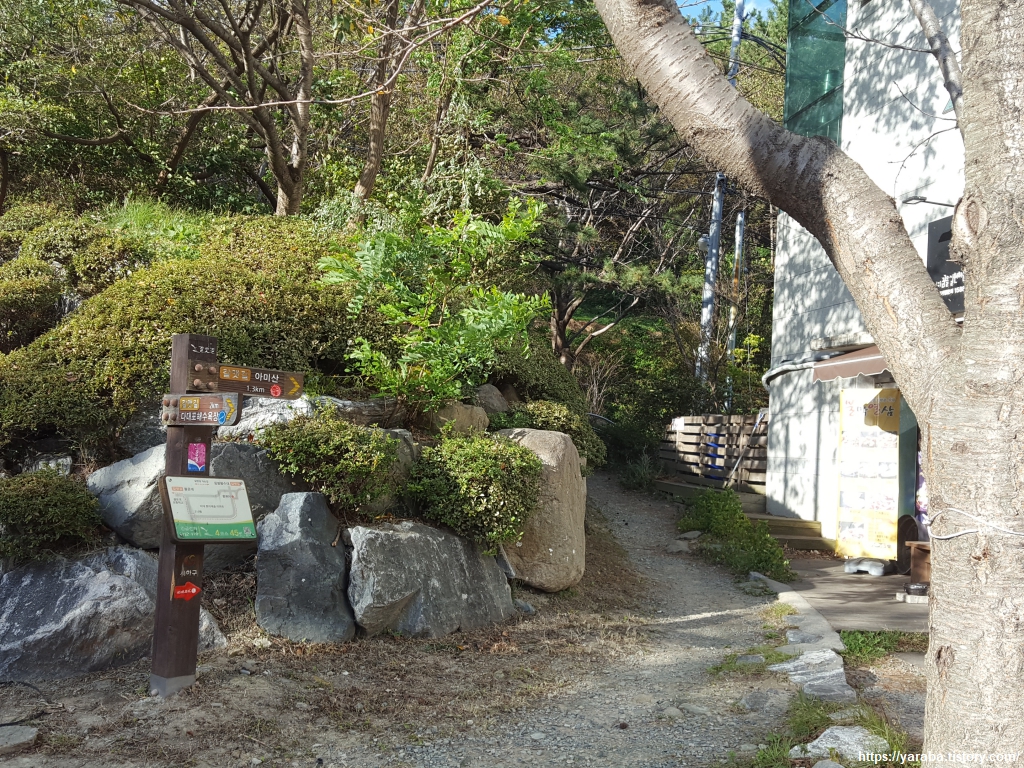 몰운대 초등학교를 끼고 우회전했다가 초등학교 담벼락 끝에서 다시 좌회전하면 아미산 산책로 입구에 닿을 수 있다.
