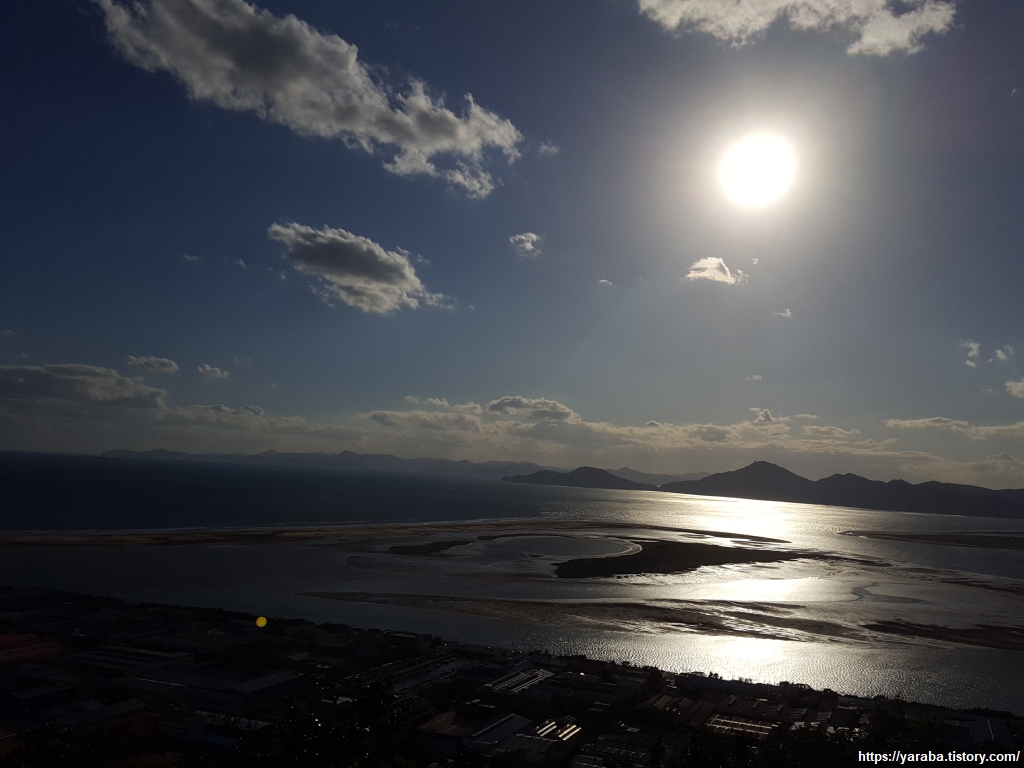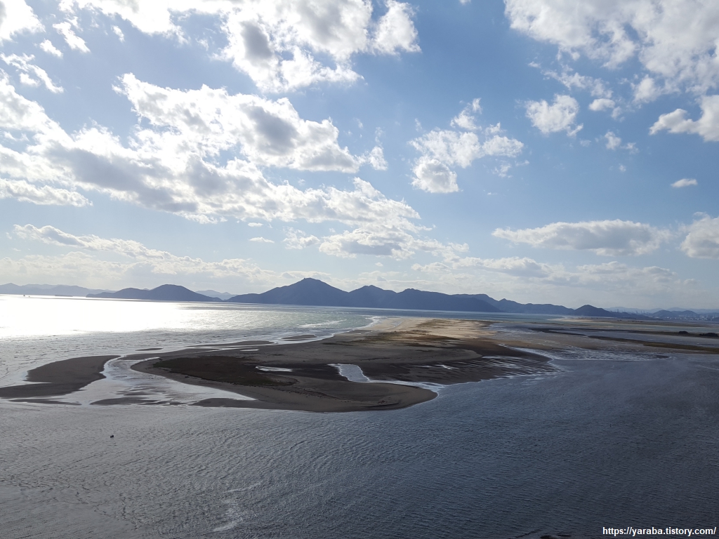 광활한 낙동강 하구의 풍경과 수많은 조각구름들이 저물어가는 태양빛의 터치에 절묘한 어우러짐으로 시야를 사로잡는다. 세상 어디에서 이런 풍경을 만날 수 있을까? 하는 감탄을 자아내게 한다.