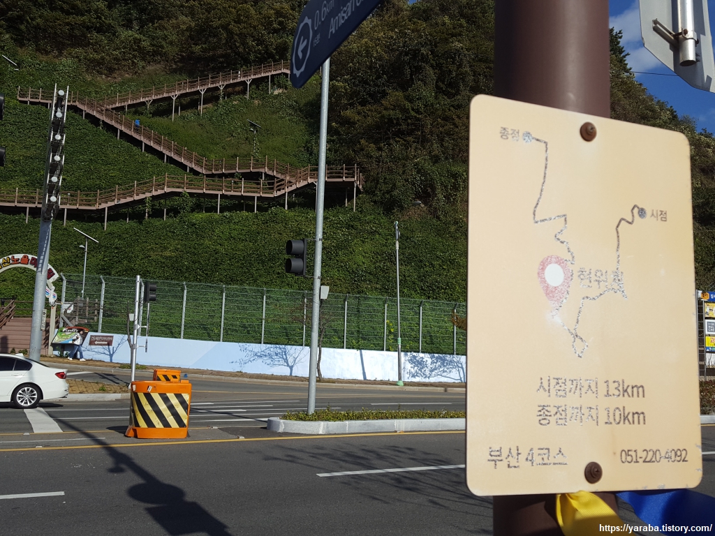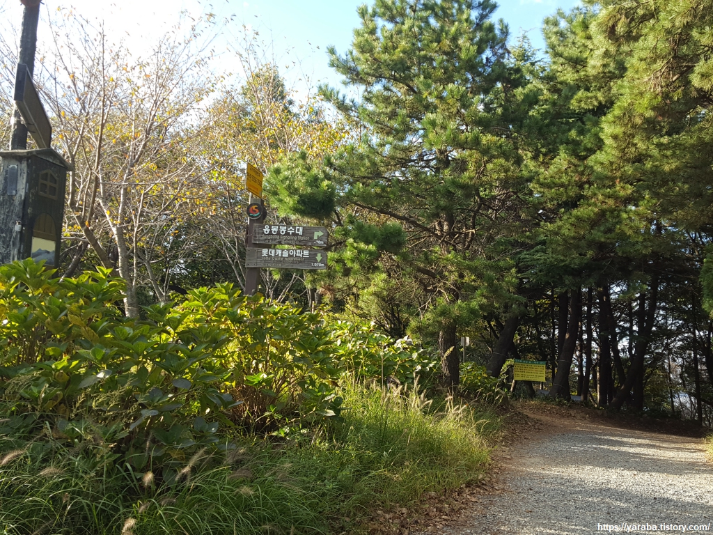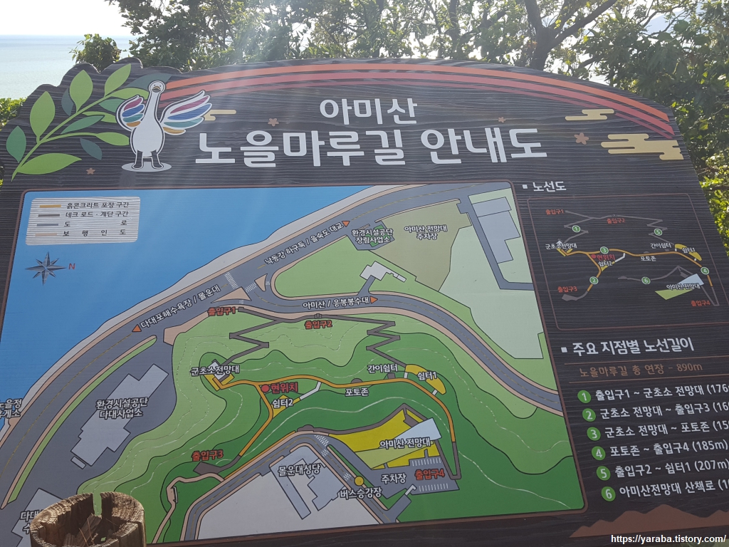 산책길이 잠시 아파트 단지와 이어지는 도로를 만나지만 도로는 부산 사하구의 상징인 고우니 로고를 끝으로 끝나고 아미산 둘레길 산책로가 이어진다.