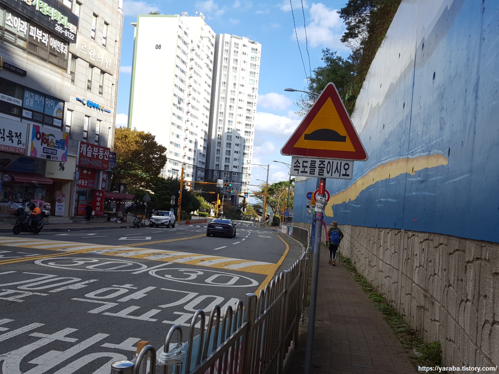 홍티 고개라는 팻말이 세워져 있는데 아마도 지금은 무지개 공단이 생기면서 없어진 홍티 마을로 가기 위한 고개라고 이름이 붙은 모양이다. 홍티는 홍치가 변한 이름인데 홍치는 무지개 홍(虹), 언덕 치(峙)를 사용하므로 우리말로 바꾸면 무지개 언덕이란 의미이다. 무지개 공단이란 이름도 이렇게 생긴 것이다. 이곳에서 응봉 봉수대로 올라가는 등산로도 있지만 남파랑길은 큰길을 따라간다.