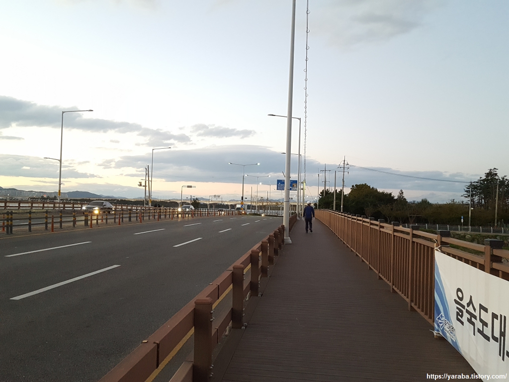 다행히 을숙도 대교 아래에 횡단보도가 있어 원래의 남파랑길로 돌아와 걸을 수 있었다. 강변 산책로는 자전거길과 함께 다리 아래를 지난다.