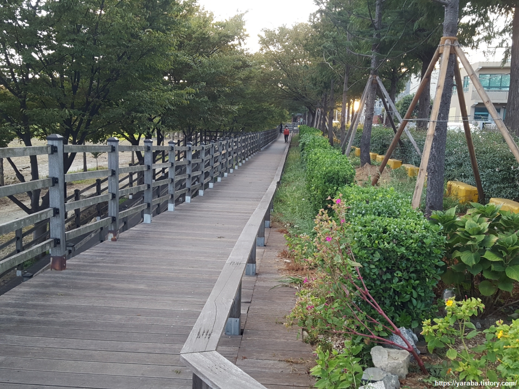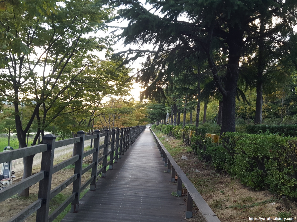 데크길을 걸으면 이곳이 공단 사이에 위치한 곳이라는 것을 잊고 숲 사이를 걷는다. 주위는 조금씩 어둠이 밀려 오지만 서쪽 하늘은 찰나의 미련을 떨구어 내듯 빛을 뿌리고 있다. 유수지 수문이 있는 곳으로 길을 건너가 이번에는 건너편에서 길을 이어간다.