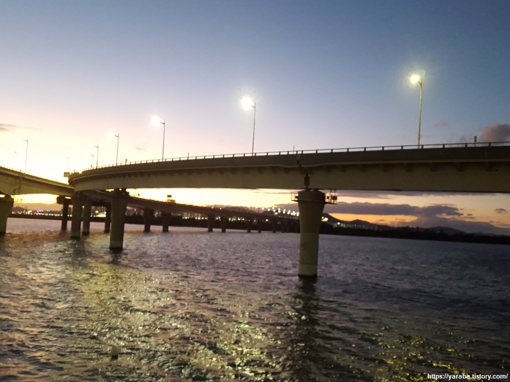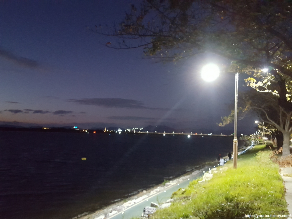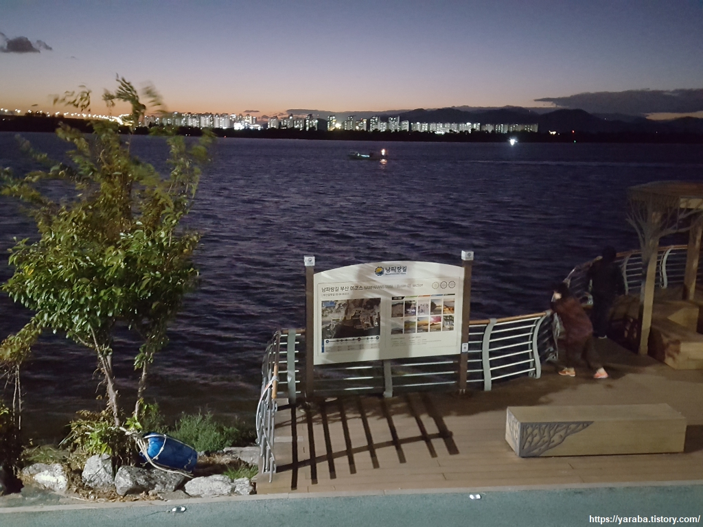 가로등이 켜진 어스름한 낙동강은 바람은 강하지만 감성만큼은 풍부하게 한다. "낙동강 강바람이~~"하는 처녀 뱃사공 노래를 입에서 절로 머금게 하는 풍경이다.