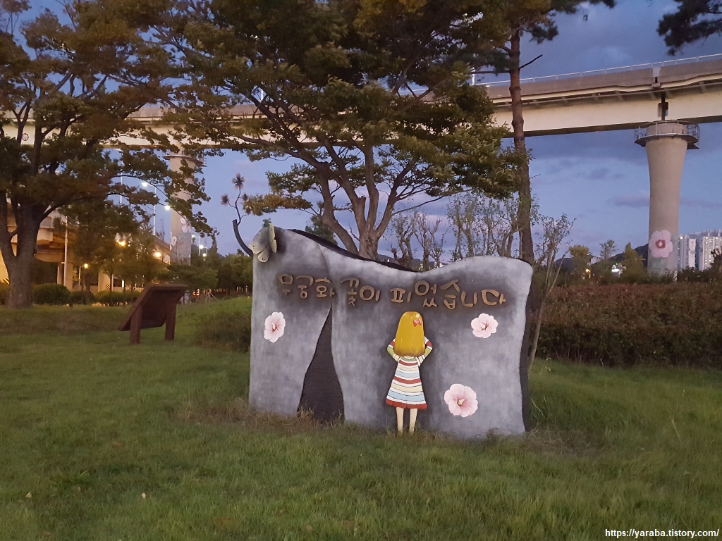 을숙도 대교 아래에 왠 "무궁화 꽃이 피었습니다"하는 조형물이 있을까? 했는데 이곳은 무궁화동산이라는 이름을 가지고 있는 곳으로 대교 나래 교차로 녹지대에 무궁화동산을 꾸미고, 을숙도 대교 아래에서 다대포 해숙욕장까지 강변로에도 무궁화를 심었다고 한다.