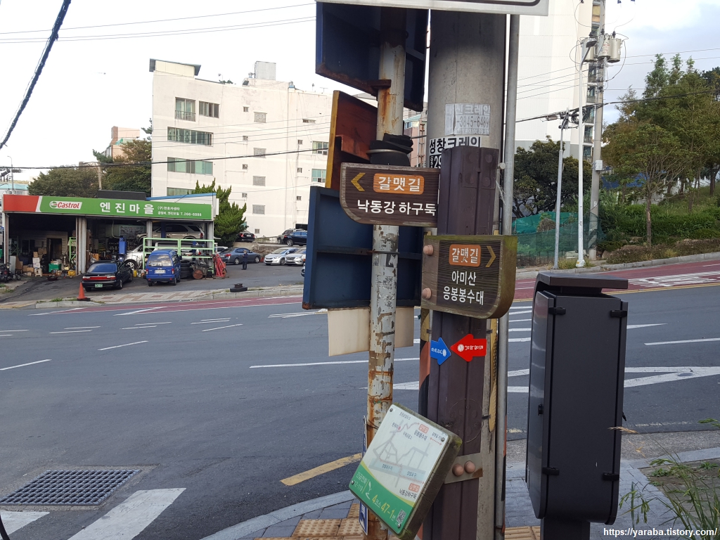 아미산 산책로에서 장림동으로 내려가는 길은 공단으로 이어져서 그런지 사람도 많지 않고 입구가 초라하다. 아파트 단지 근처의 산책로가 깔끔하고 잘 정비되어 있는 것은 전국의 법칙과도 같은 현상이니 그러려니 한다. 공단 너머로 을숙도 대교도 눈에 들어온다. 저 다리 아래를 지나야 오늘의 걷기가 끝나니 왠지 계속 끌리는 곳이다.