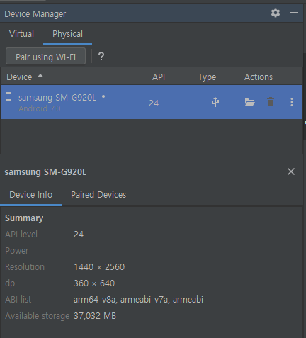 실제 기기로 테스트 하려면 USB 케이블로 실제 기기와 연결하고 기기의 설정> 개발자 옵션에서 디버깅 모드 사용을 켜주면 위의 그림처럼 안드로이드 스튜디오의 장치 관리자> Physical 탭에서 해당 기기를 자동으로 확인할 수 있고, 해당 기기를 선택한 상태에서 Run 'App'을 클릭하면 새로 제작한 앱을 실기기에서 테스트할 수 있다.