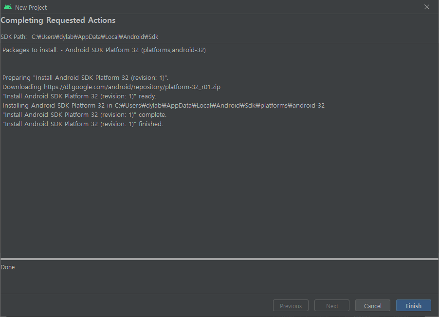 선택 사항에 따라 필요한 환경을 준비하는 과정을 거쳐서 프로젝트의 기본 얼개를 만들어 준다. 시간이 조금 걸리므로 대기해야 한다. [Finish]로 마무리한다. 이 과정은 환경에 따라서 나오지 않을 수도 있다.