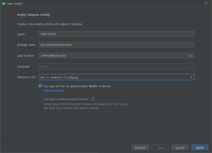 새로운 프로젝트의 정보를 작성하는 화면으로 앱의 이름을 적절하게 입력한다. 패키지 이름은 앱 이름을 입력하면 자동으로 작성해 주므로 손대지 않아도 된다. 저장 경로를 확인한다. 사용 언어가 자동으로 코틀린으로 설정되어 있는데 코틀린은 안드로이드용 개발 언어로 자바 언어와 완전히 호환되므로 초창기 자바 언어로 생각해도 무방하다. 최소 SDK 버전이 기본적으로 롤리팝으로 선택되어 있는데 특정 버전을 선택하면 얼마나 많은 기기로 호환성이 있는지도 백분율로 표시해준다. [Finish]로 프로젝트 작성을 시작한다.