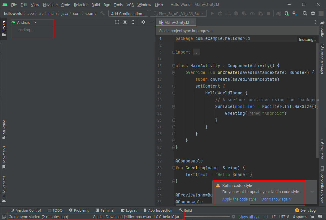 프로젝트가 열려도 필요한 내용을 다운로드하고 설치하느라 시간이 걸리므로 "loading..." 메시지가 사라지고 좌측 하단에 "Gradle sync finished"가 나올 때까지 기다려야 한다. 우측 하단에 코틀린 코딩 스타일을 적용할 것인지 묻는 창이 나오는데 적용해도 좋고, 다음부터 표시하지 않도록 해도 된다.