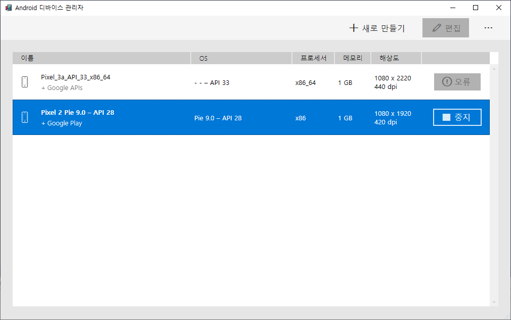 도구 > Andriod > Andriod 디바이스 관리자를 실행하면 가상 머신을 만들어서 실행 결과를 가상 머신에서 바로 확인할 수 있다.