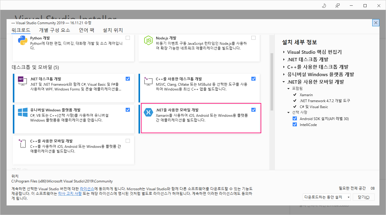 윈도우 시스템과 비주얼 스튜디오 자체의 업데이트를 모두 반영한 상태에서 위의 그림처럼 도구 > 도구 및 기능 가져오기 메뉴에서 ".NET을 사용한 모바일 개발" 요소를 추가로 설치하면 자마린(Xamarin)과 안드로이드 개발 환경을 자동으로 설치한다.