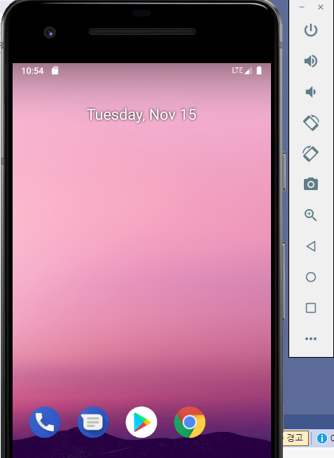 안드로이드 프로젝트를 우측 마우스로 클릭하여 콘텍스트 메뉴 > 디버그 > 새 인스턴스 시작으로 앱을 가상 머신에서 수행한 결과 화면이다.