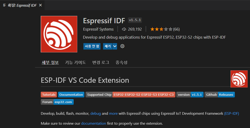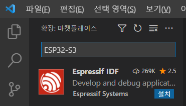 위의 그림처럼 개발 대상 칩의 코드로 검색하면 ESP-IDF를 찾을 수 있는데 [설치] 버튼으로 설치를 진행한다.