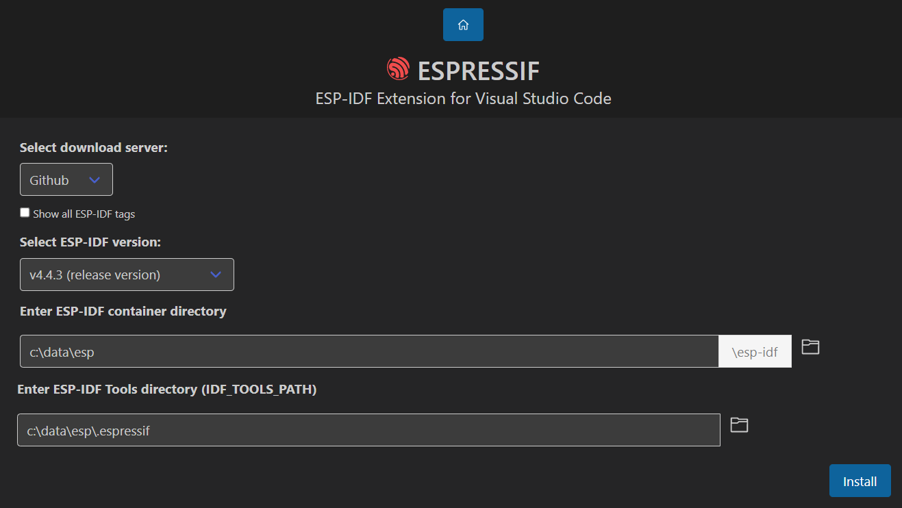 ESP-IDF 버전을 선택하고 나머지 폴더를 선택한 다음 [Install] 버튼으로 설치를 진행한다.