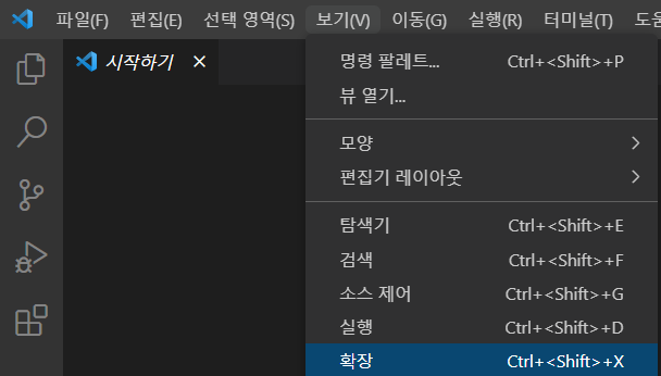 VSCode에서 작업 중인 폴더들을 모두 닫고 위의 그림처럼 "보기 > 확장" 메뉴를 선택한다.