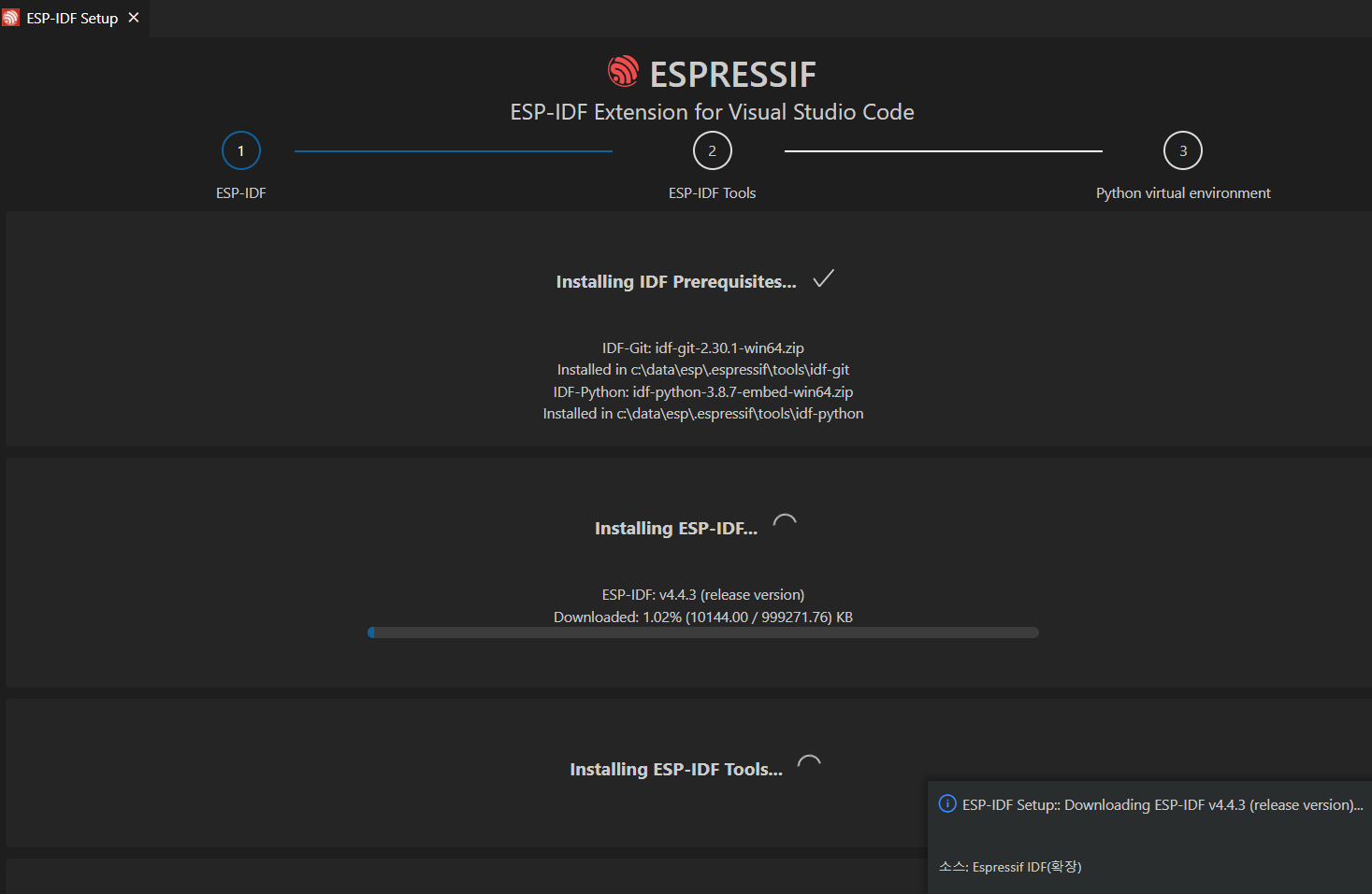 깃(Git), 파이썬과 같은 필요 도구들과 ESP-IDF 및 기타 도구들이 깃허브를 통해 설치되는 것을 확인할 수 있다.