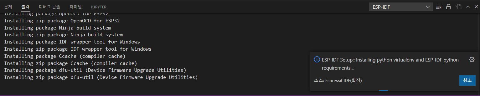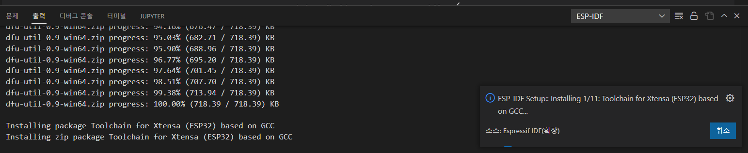 ESP32 CPU용 도구들이 설치되고 있는 화면이다.