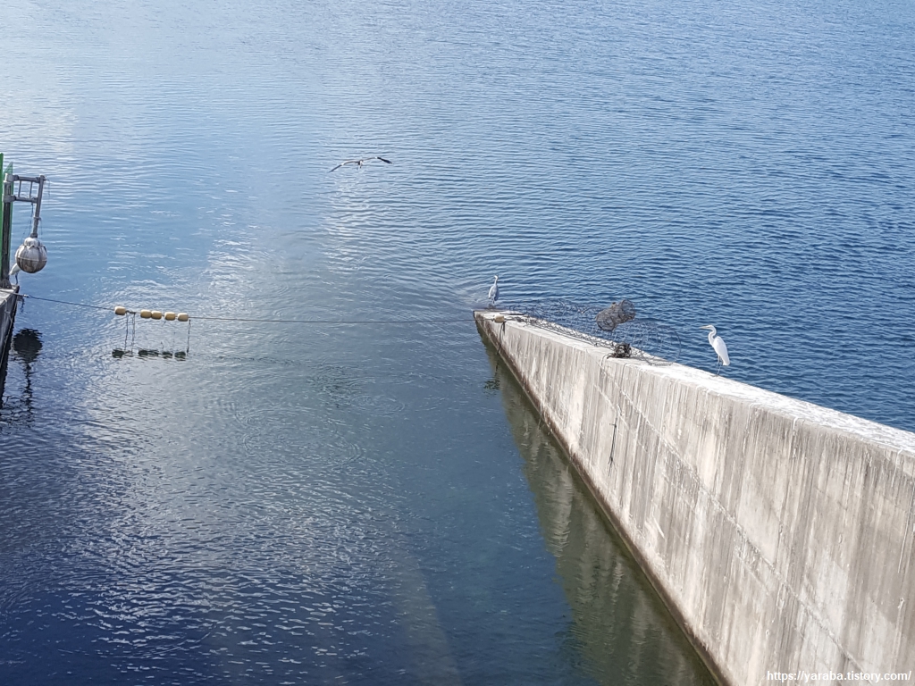 을숙도 바로 옆으로 설치된 어도 관람실 입구의 모습이다. 강 아래로 어도가 흐르는 모습을 유리를 통해서 직접 볼 수 있다. 이곳이 물고기들이 지나는 길이란 것을 알고 있는지, 새들이 길목을 지키고 있다.