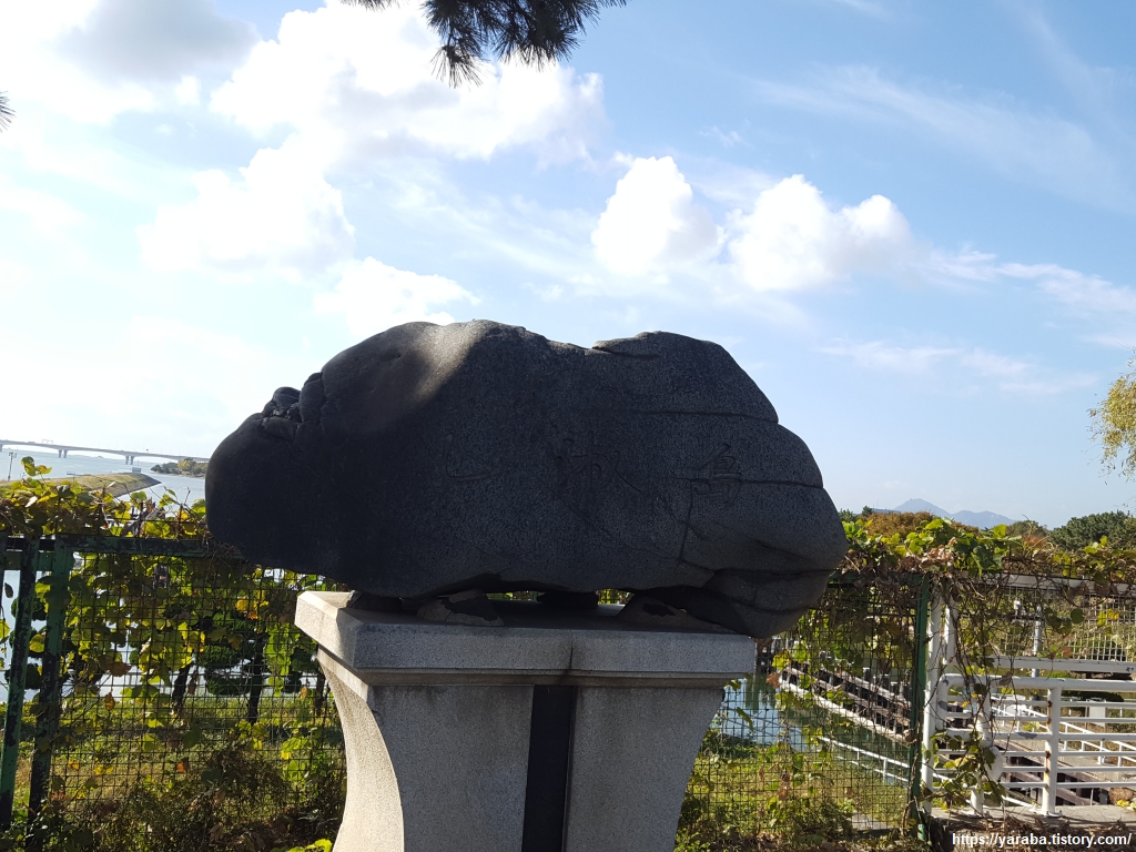 갑문 위로는 색 바랜 을숙도(乙淑島) 비석이 외롭게 서있다. 을숙도는 새 을(乙) 자와 맑을 숙(淑) 자를 사용하는 것처럼 새가 많고 물이 맑아 붙은 이름이지만 조선 시대만 해도 없던 섬으로 대동여지도에도 등장하지 않다가, 일제 강점기부터 형성되었다고 한다. 을숙도를 지나면 만날 명지동이 명지도 섬으로 존재했을 뿐이다. 산업화의 물결 속에 새가 많고 물이 맑다는 이야기는 옛이야기가 되고 말았다. 1997년까지만 해도 을숙도는 서울의 난지도처럼 쓰레기 매립을 했었다고 한다. 지금은 생태 공원을 만들었다고 하지만 비행기가 날고 사람과 자동차가 오가는 곳에 철새가 예전처럼 찾아들기는 만무한 일이다.