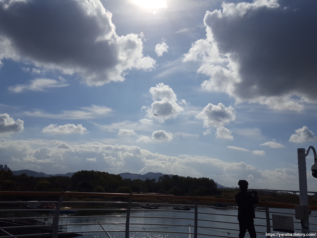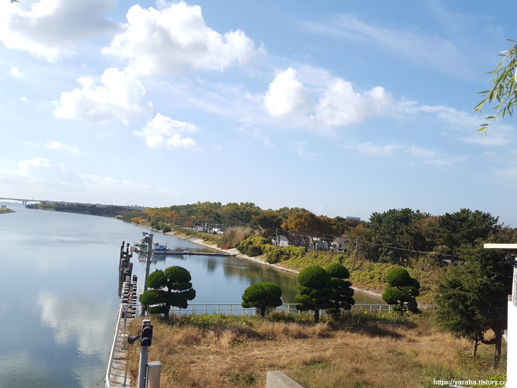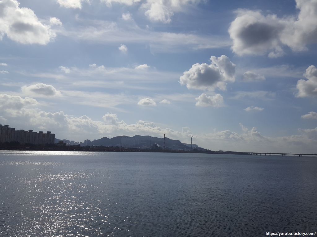 하구둑에서 바라본 부산 사하구 방면의 전경. 아직은 동쪽에 있는 오전의 태양이 은빛 물결을 만들고, 조각구름들을 비추면서 맑은 가을 하늘의 아름다움을 그려낸다.