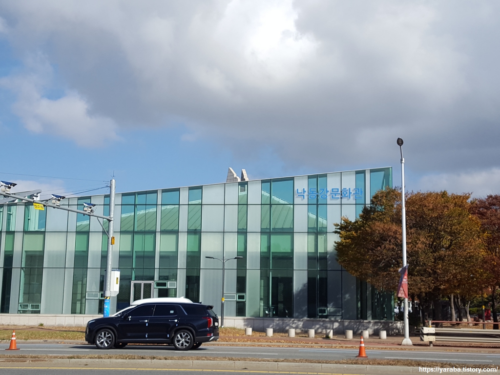 길 건너 4대 강 사업의 일환으로 건립된 낙동강 문화관과 을숙도 철새 도래지라는 표지석이 자연과 인공이라는 대립점 가운데서 과연 어울리는 조합인가? 하는 의문을 남긴다.