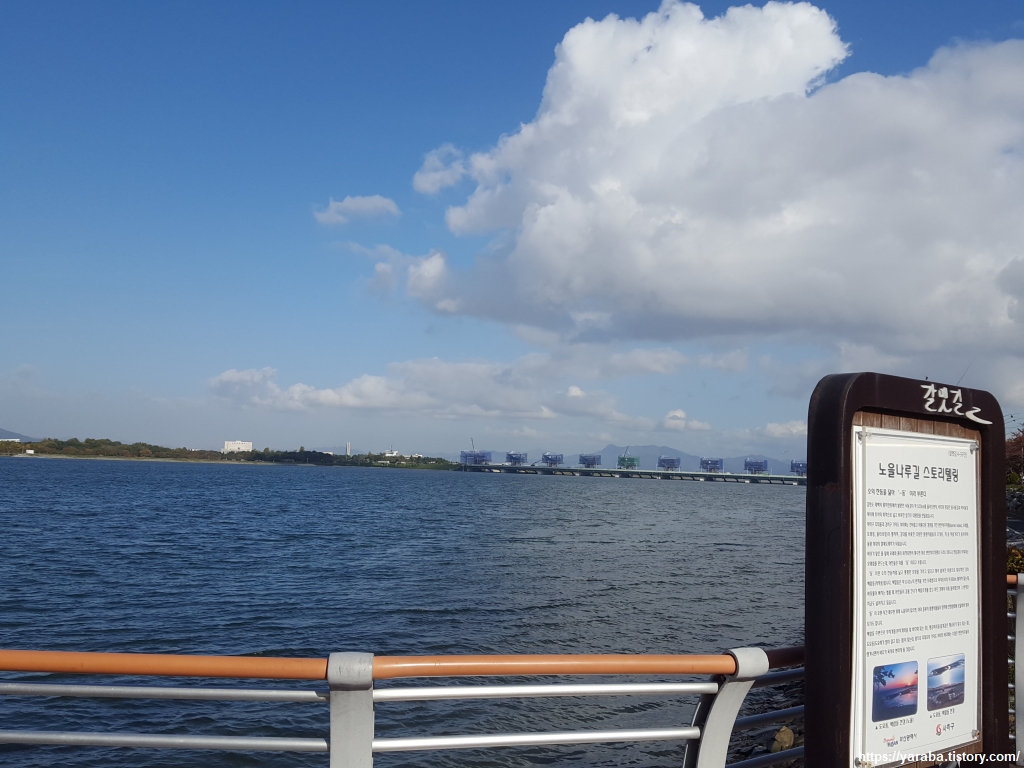 노을 나루길에서 좌회전하여 낙동강 하구둑에 들어선다. 1987에 건설될 당시에는 수위를 높여서 각종 용수를 확보하고 김해평야를 보호하며 인근에 공단을 조성하려는 목적이었다. 강바닥의 흙으로 습지와 개펄을 메워 공단을 조성하고 택지로 공급했다. 문제는 강물의 오염과 생태계 파괴였는데 상시 개방은 아니지만 2018년부터 조금씩 수문을 열어 바닷물을 유통시키기 시작했다고 한다. 김해평야의 농업용수와 부산시 상수도 취수원에 문제가 되지 않는 선에서 잘 조절되었으면 하는 바람이다.
