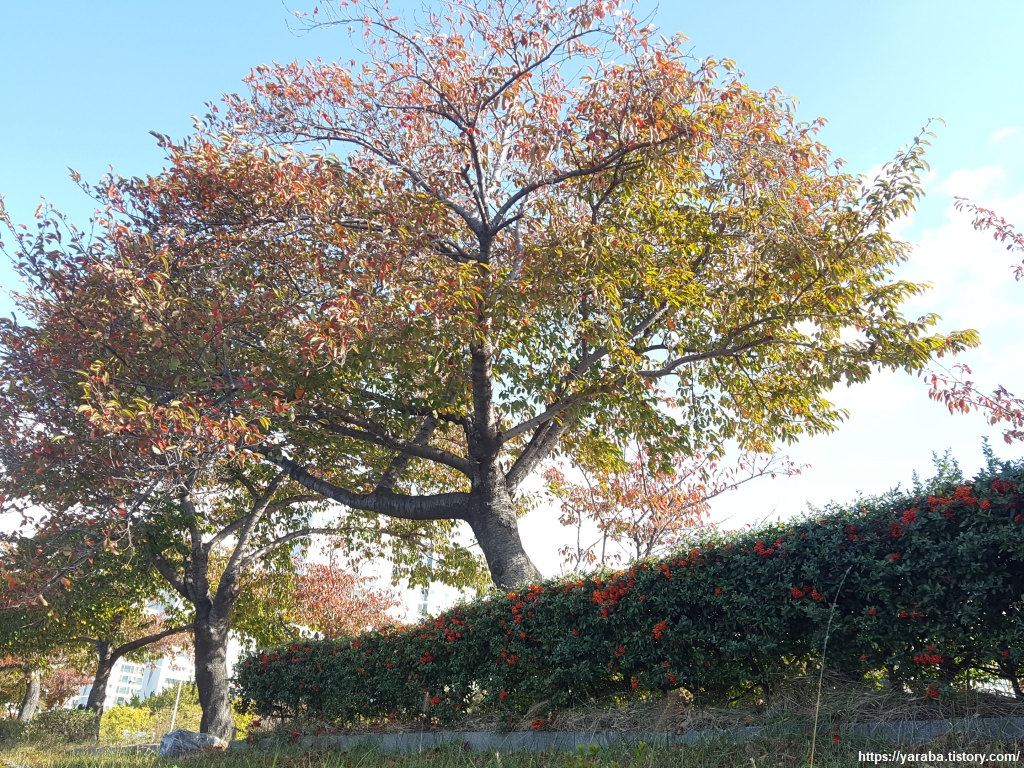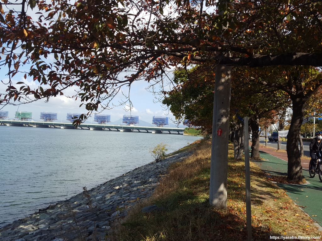 노을 나루길 산책로에서는 큼직한 벚나무들이 화사했던 봄 꽃의 향연과는 다른 모습의 화려한 가을 단풍의 옷으로 갈아입고 있다.