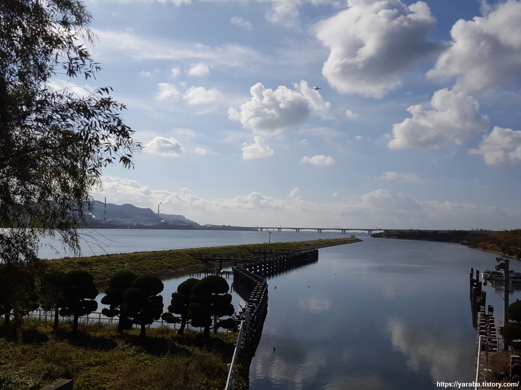 낙동강 하구둑을 지나는 길, 하구둑이라고 하지만 10개의 수문과 왕복 8차선의 도로가 지나는 엄청난 규모의 댐에 해당한다. 을숙도 쪽으로는 어선이 오갈 수 있는 운하 형태의 물길과 갑문도 마련되어 있다.