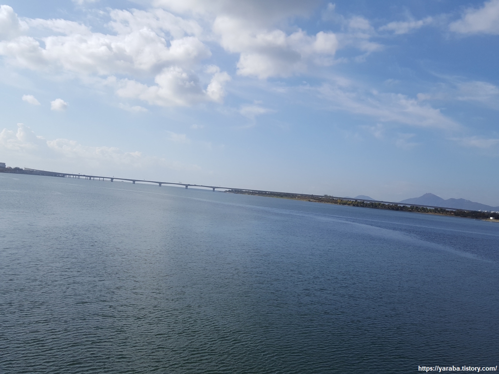 하구둑에서 바라본 을숙도 대교의 모습. 이곳은 하구둑 바깥이니 바다이지만 잔잔한 호수 같은 바다다.