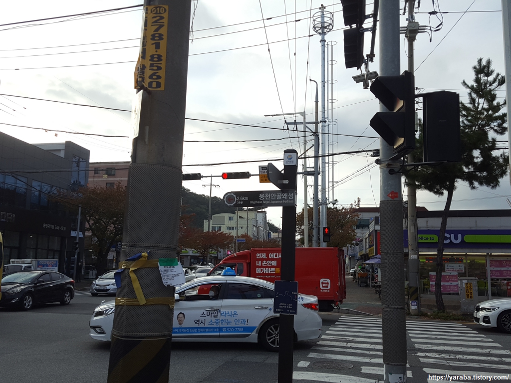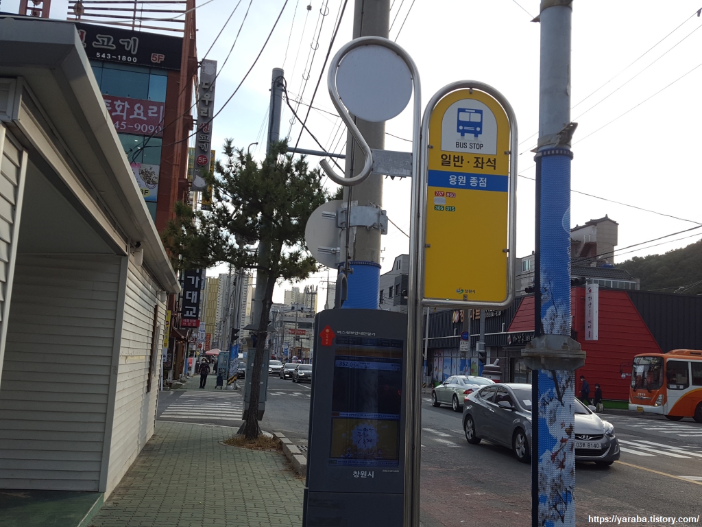 부산 5코스부터 함께 길을 했던 아들은 육중한 몸무게를 하나도 받쳐주지 못하는 얇은 신발 탓에 발바닥이 엉망이 되고 말았다. 웅천 안골 왜성으로 좌회전하여 길을 건너야 하는데 마침 신호등 앞에 있던 가게에서 세일 중이던 신발을 급하게 구입하여 길을 다시 걷기 시작했다. 다 큰 아들은 티를 내지 않으려 했지만 이미 망가져 버린 발바닥은 어쩔 수 없는 모양이었다. 발걸음이 부자연스럽다. 먼 길 걷기는 튼튼한 바닥을 가진 신발이 필수이다. 용원동은 부산과 창원의 경계선답게 많은 부산 버스들의 종착점이자 시작점이다.