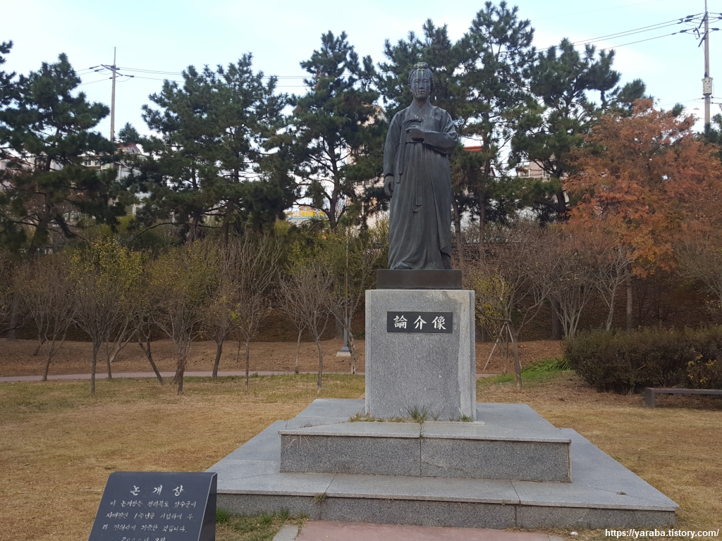 안청 공원에서 잠시 쉬었다 간다. 벤치에 앉아 길을 같이 걸은 아들의 발을 보니 상황이 좋지 않다. 공원에서 휴식을 취하며 잠시 주위를 돌아보니 한 여성의 동상이 세워져 있는데 "논개상"이었다. 논개 하면 진주성을 떠올리게 되는데 여기에 왜 논개상이 있을까? 하는 호기심에 둘러보니 전북 장수군이 자매결연 기념으로 기증한 것이라는 안내비가 있었다. 알고 보니 논개의 고향은 전북 장수라고 한다.