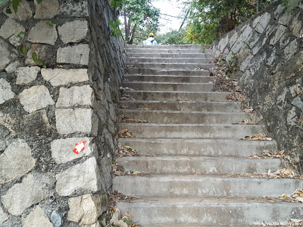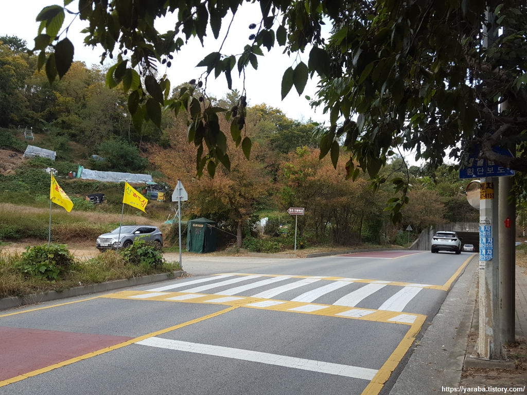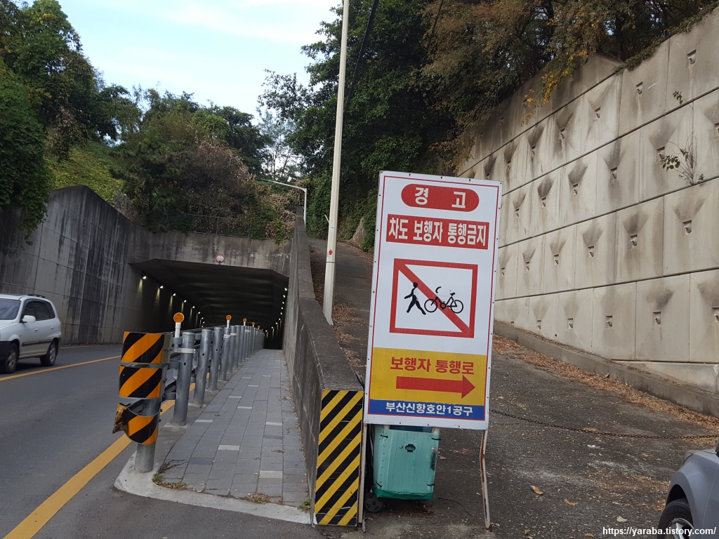 터널을 지나야 하나 말아야 하나 잠시 고민을 하게 했던 지점이다. 경고판에는 "차도 보행자 통행금지"라고 적혀 있고 보행자 통행로 화살표도 산으로 올라가는 계단을 향하고 있으며 남파랑길 표식도 산으로 향하고 있었지만 터널 안으로는 만든 지 얼마 되지 않아 보이는 보행자 통로가 있었다. 이리저리 살펴보다가 길이 터널 바깥으로 이어지지 않으면 어떡하지? 하는 생각에 남파랑길 표식을 따라 산을 오르기 시작한다.