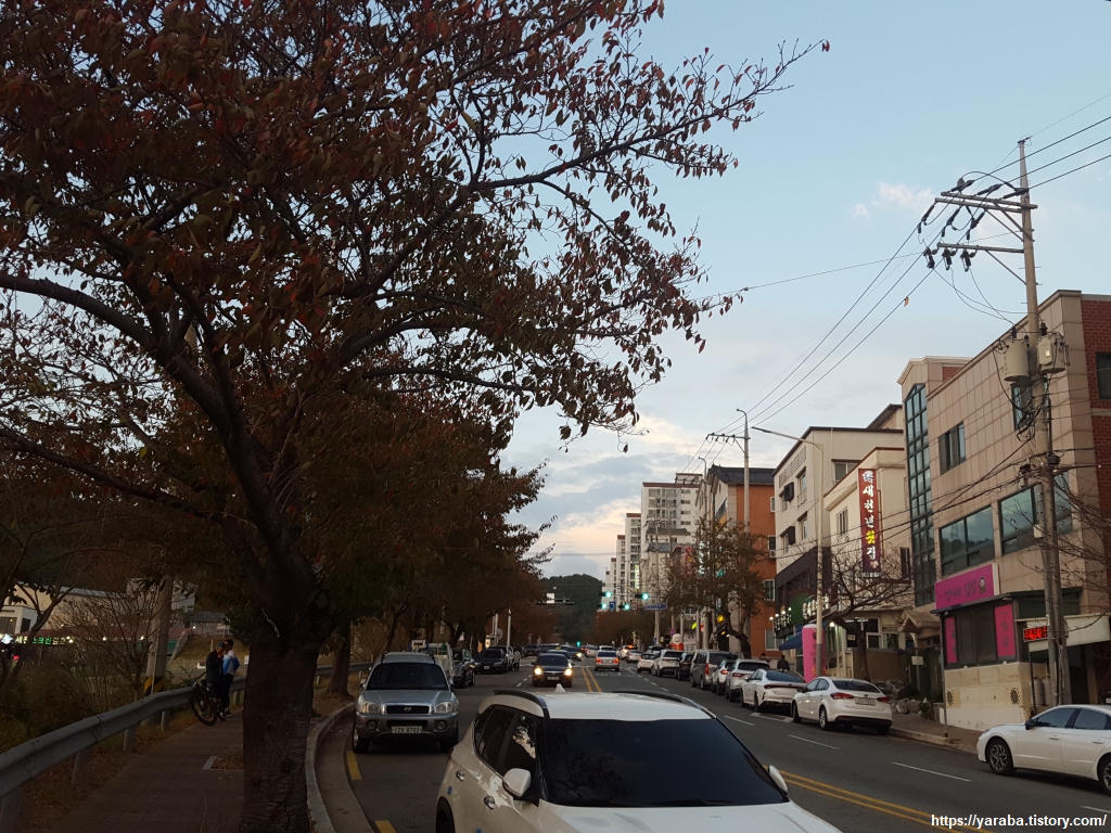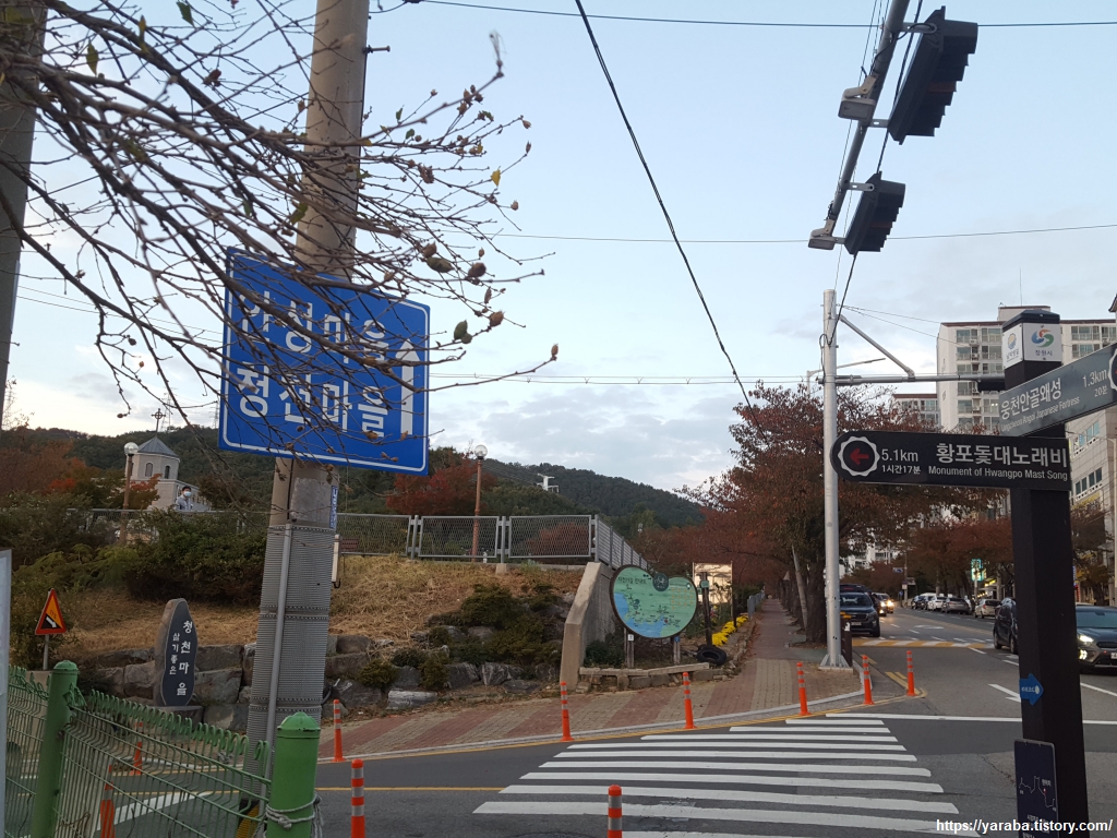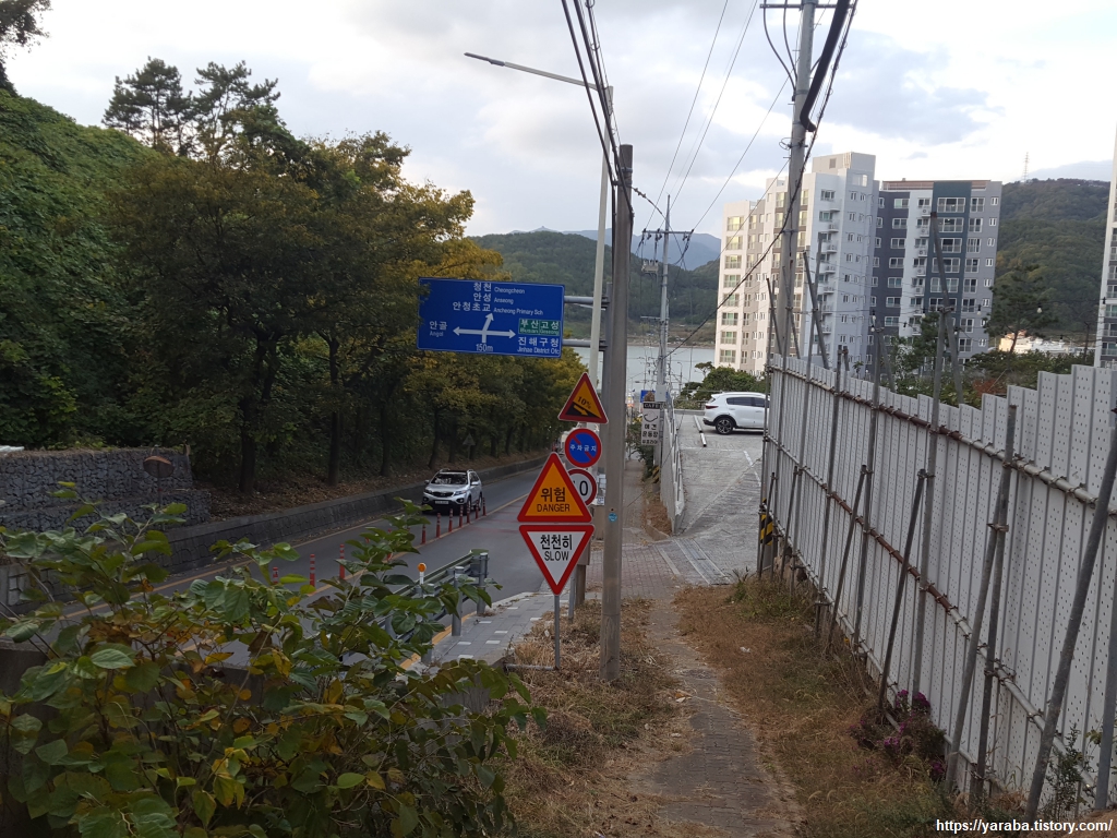 길은 이제 안골동의 아파트 단지를 뒤로하고 청천 마을로 들어선다. 이곳의 가로수들은 진해의 상징과도 같은 벚나무 들이다. 화려한 봄에 이곳을 지났다면 어땠을까? 하는 상상을 해본다.