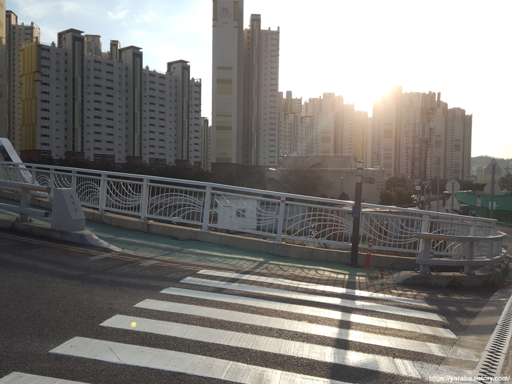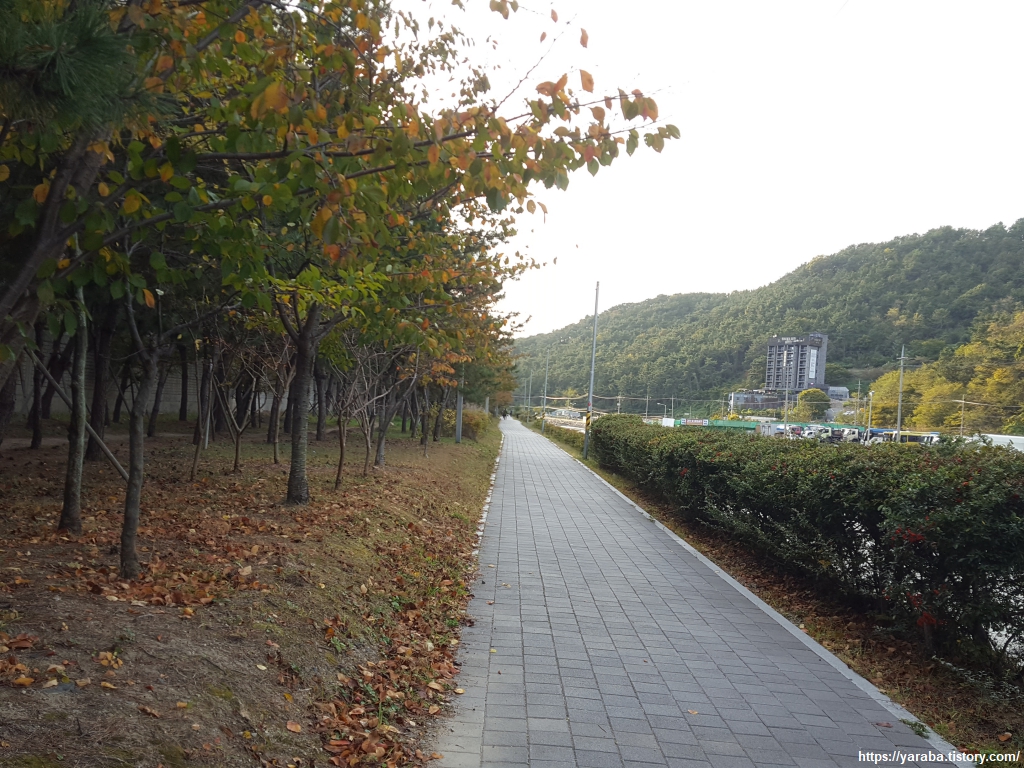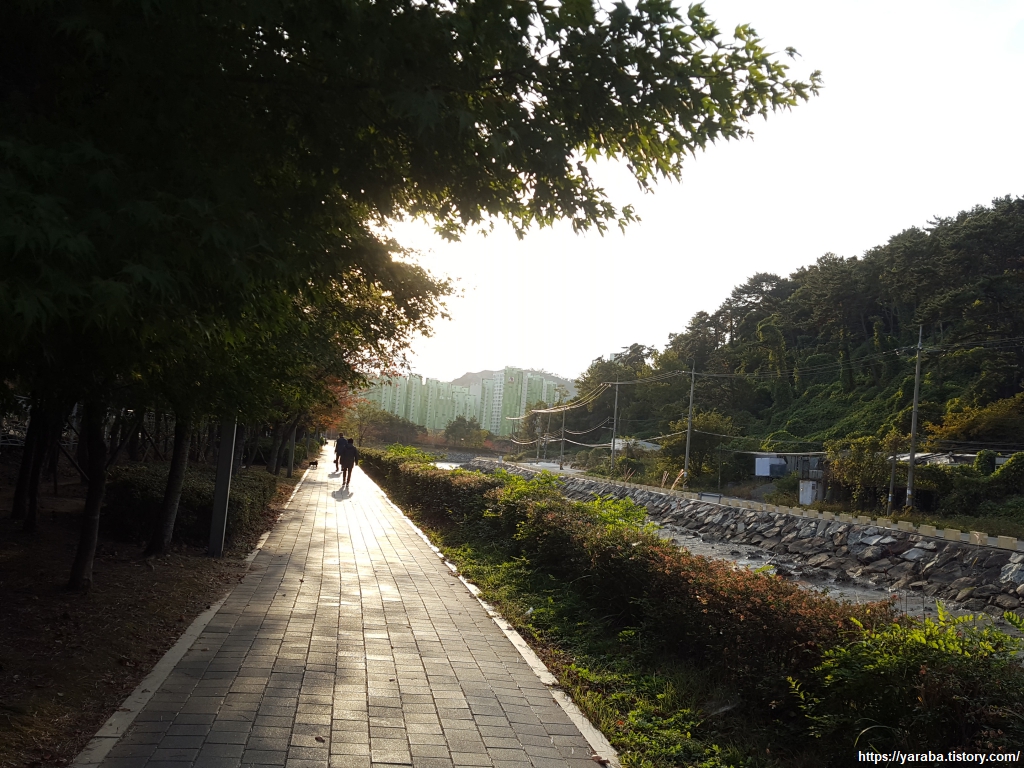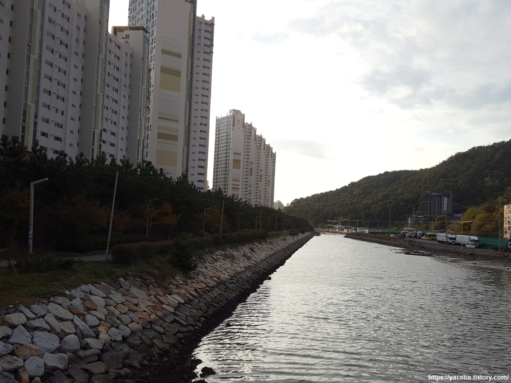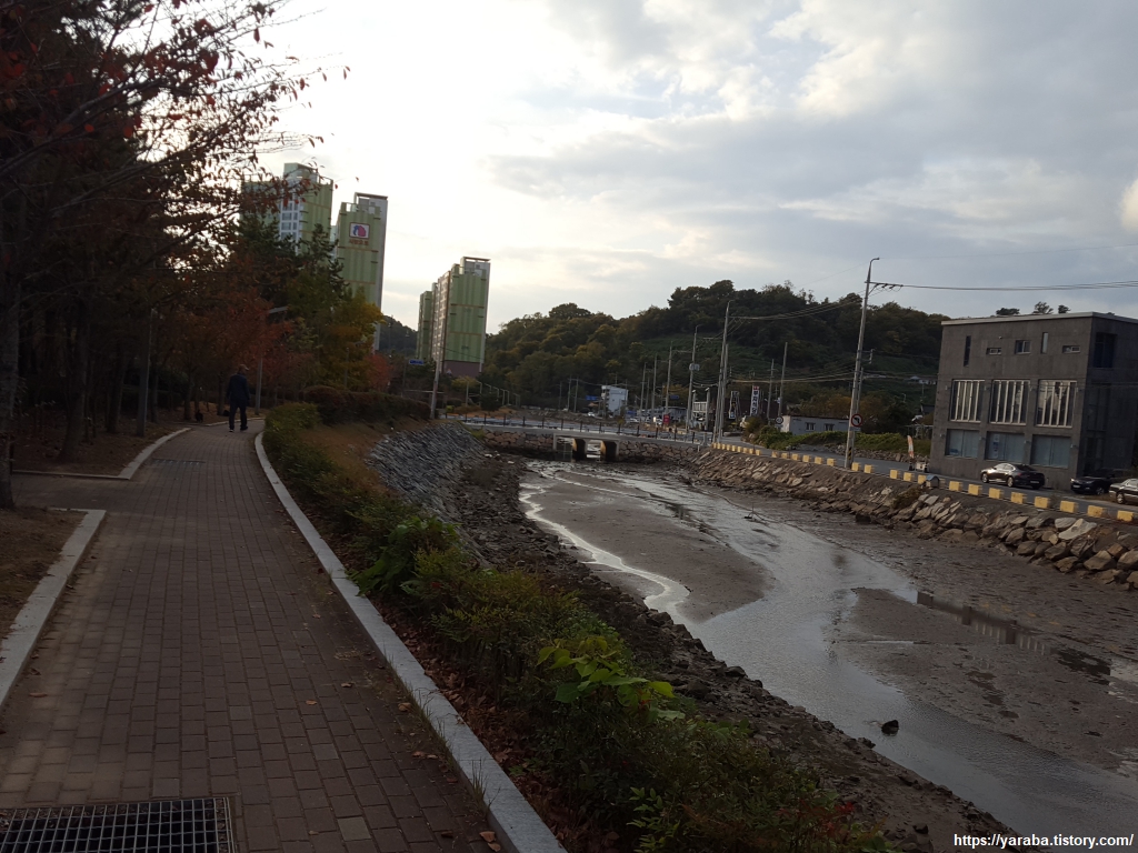 눌차도 앞에서 가덕 대교를 지나 송정천과 만났던 남해 바다의 물이 깊게 들어온 수로 옆으로 아파트 단지의 산책로를 걷는다.