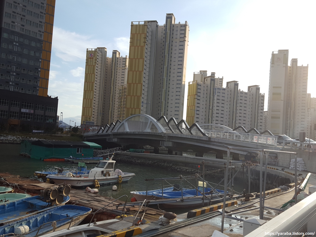 용원 어시장을 떠나서 용원교를 지나 아파트 단지로 들어서면서 또다시 이곳에 대형 공업 단지와 항만이 있다는 것을 잊는다. 웅천 안골 왜성 방면으로 가면서 어차피 우회전하므로 다리를 건너지 않아도 길을 갈 수 있지만 아파트 단지 쪽에 좋은 산책로가 있으므로 다리를 건너 우회전하여 길을 이어 간다.