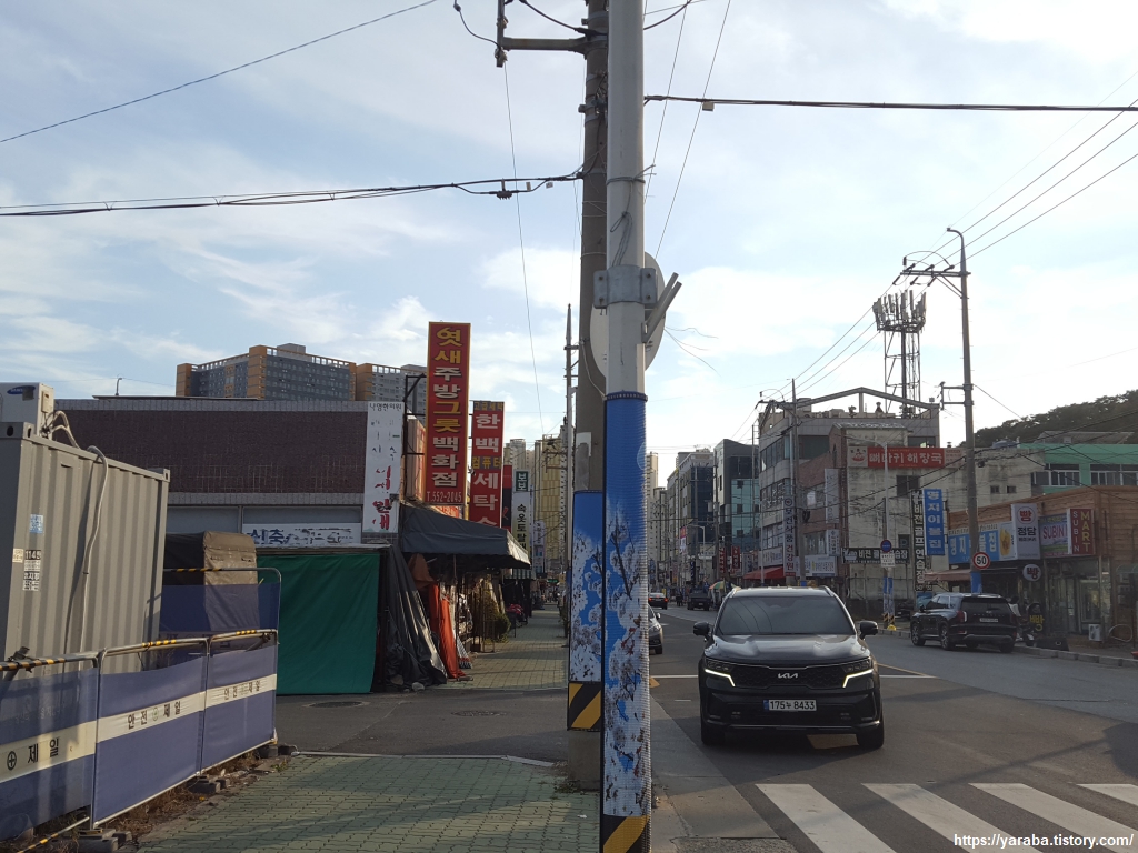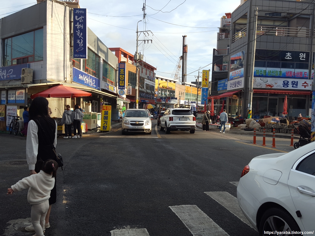 용원 어시장을 지나는 길, 이곳이 거대한 크레인들이 즐비한 부산 신항이 배후에 있고 바로 옆으로 엄청난 공업 단지가 있다는 것은 상상이 되지 않을 정도로 수산물을 사고팔고 하느라 분주하다.