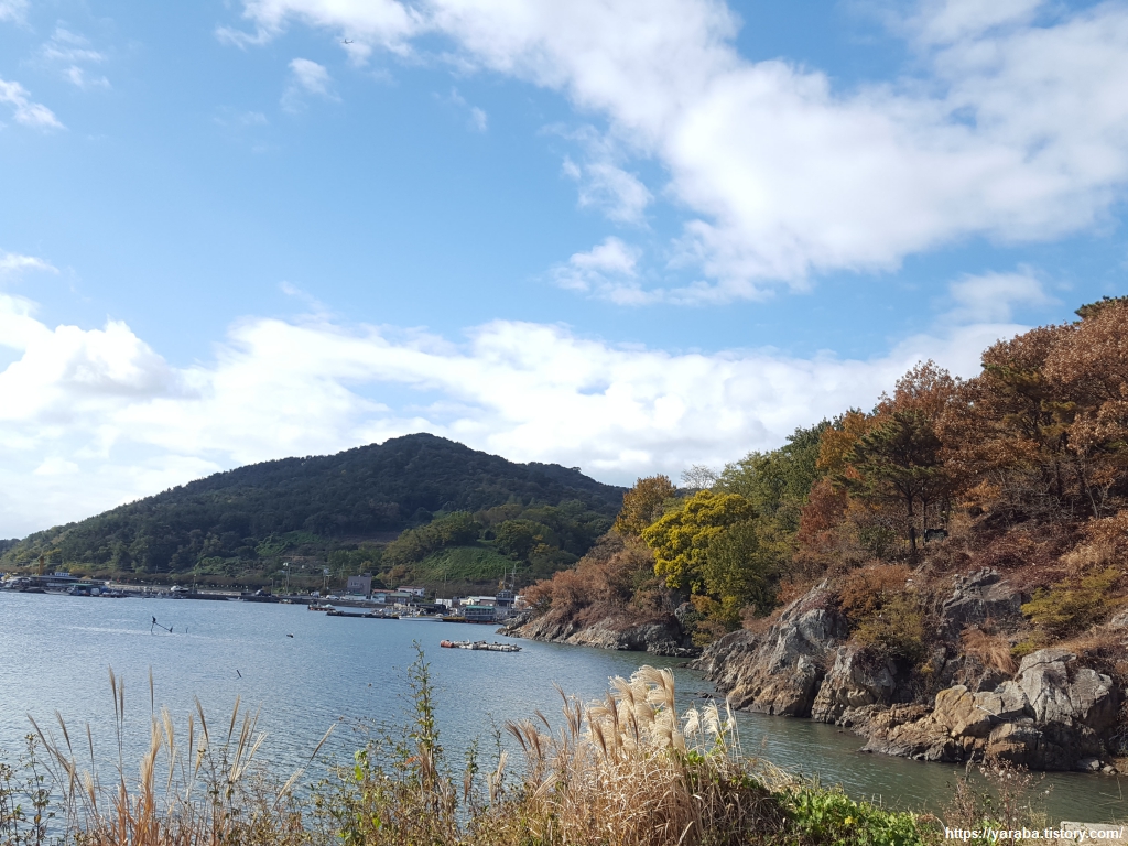 가을색이 만연한 해안 풍경이 한 폭의 그림이다. 햇살에 반짝이는 억새풀, 푸른 하늘빛을 담은 바다, 세월의 기록이 새겨진 바위들, 화려하지 않지만 단풍으로 겨울을 준비하는 나무들까지, 태양의 기막힌 조명 아래 보아도 보아도 질리지 않을 풍경화를 그려낸다.