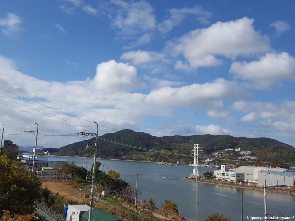 진해구 두동에서 숙소는 외인촌 모텔이었다. 주인장이 예약 확인하느라 몇 번 전화 통화한 것을 제외하면 3인 입실이라고 이불도 갖다 주시고 고마운 분들이었다. 하룻밤 휴식 후 맞이한 아침 하늘은 흰구름이 둥둥 떠있는 청명한 가을 하늘이다.