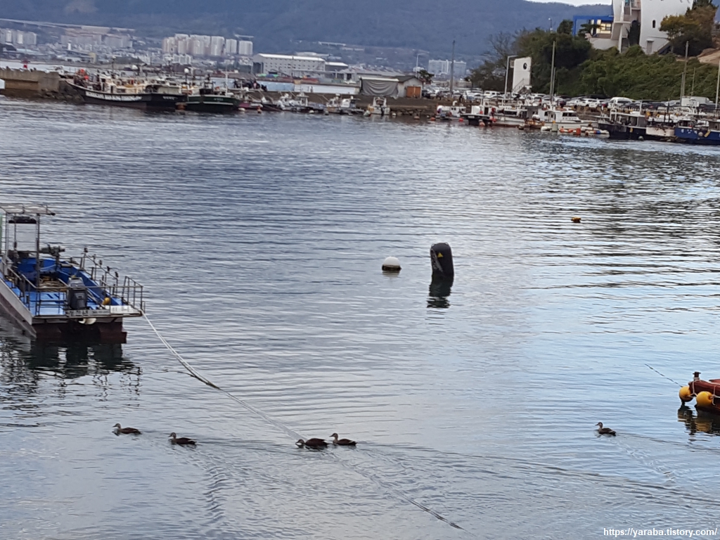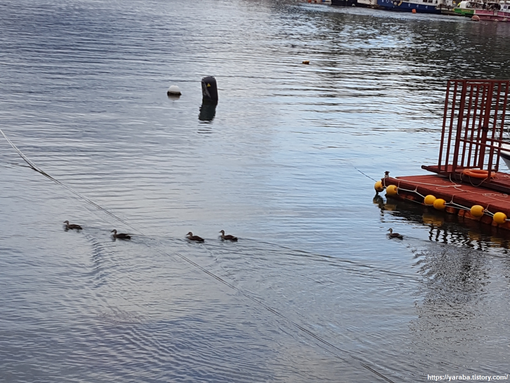 나들이 나온 사람들이 북적이는 항구에서는 한 무리의 오리 가족들도 잔물결을 일으키며 나들이를 나서고 있다.