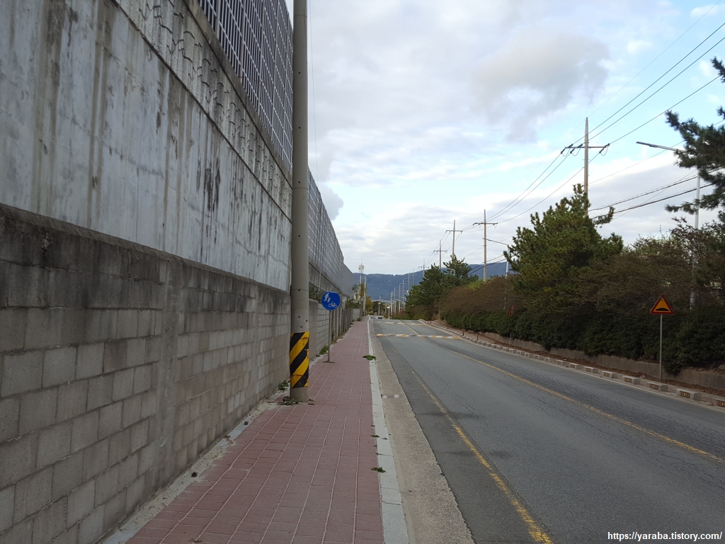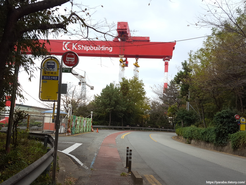 죽곡항을 떠난 길은 엄청난 높이의 울타리로 가림막을 해놓은 좁다란 조선소 옆길을 따라 올라간다. 가끔씩 조선소 안에서 벨소리가 들리기도 하는데 어떤 때는 음악과 함께 어떤 안내 방송이 나오기도 했는데 아마도 교대 근무 시간을 알리는 소리가 아닐까? 하는 추측을 해본다.