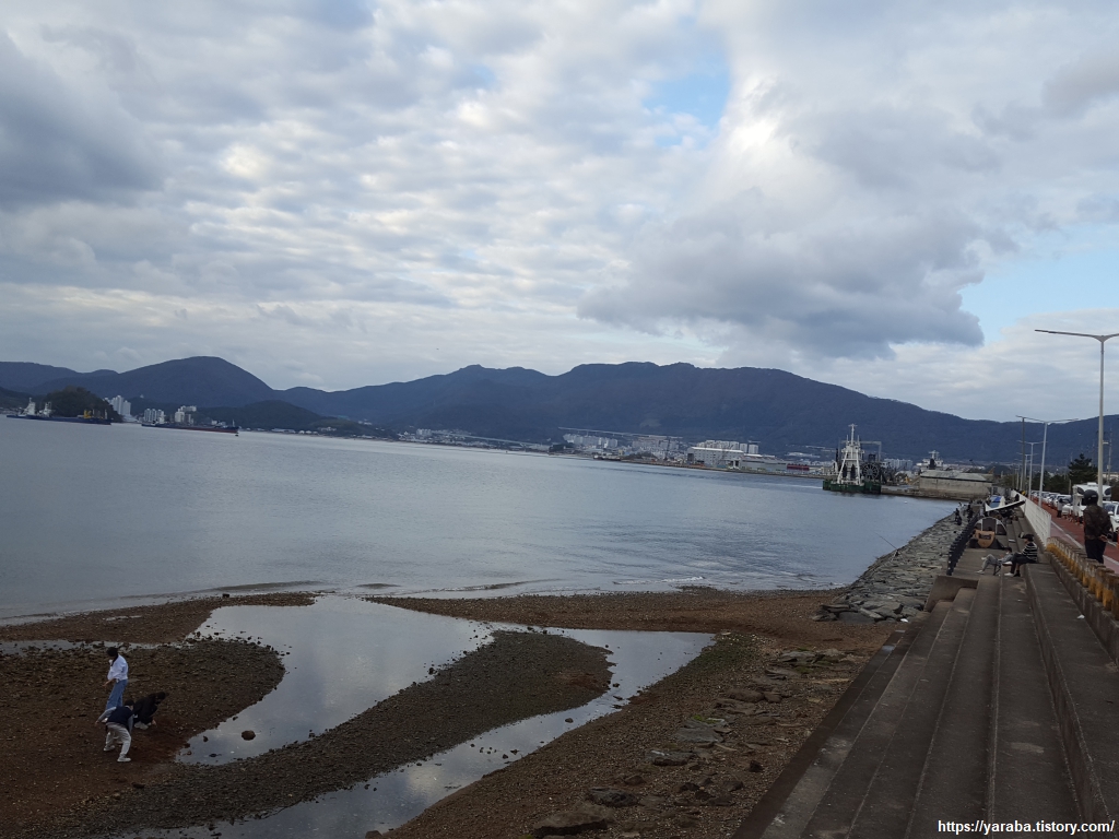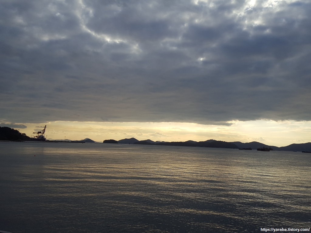 일몰 시간까지는 아직 시간이 남았는데 하늘을 가득 채운 구름 덕택에 진해만 입구를 통해 바라보는 서쪽 하늘의 태양이 석양과 같은 독특한 그림을 만들어 낸다.