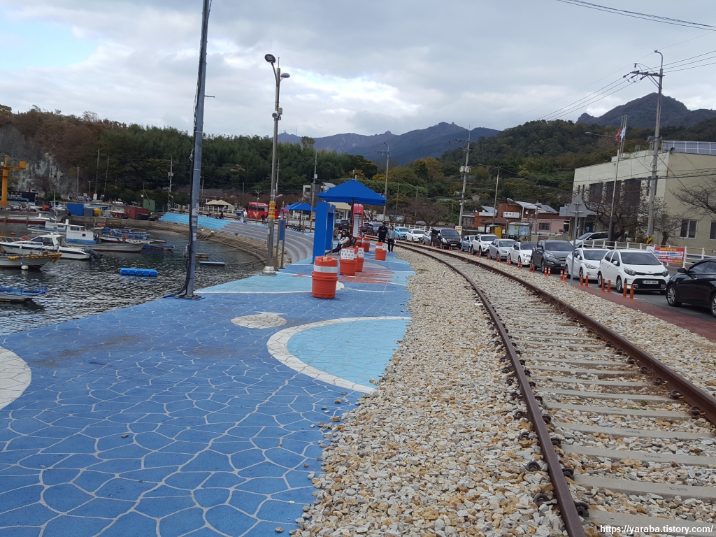 내리막길에서 예비군 훈련장을 지나 해변으로 나오면 철길과 화려한 그림으로 장식된 행암동 해안에 도착한다. 화장실도 다녀오고 벤치에서 잠시 휴식을 취한 다음에 발바닥 부상으로 7코스 종점에서 버스로 미리 도착해서 기다리고 있는 아들을 향해서 다시 부지런히 걷는다.