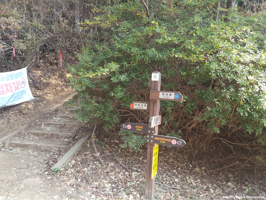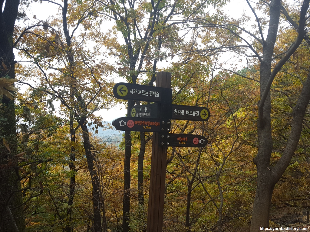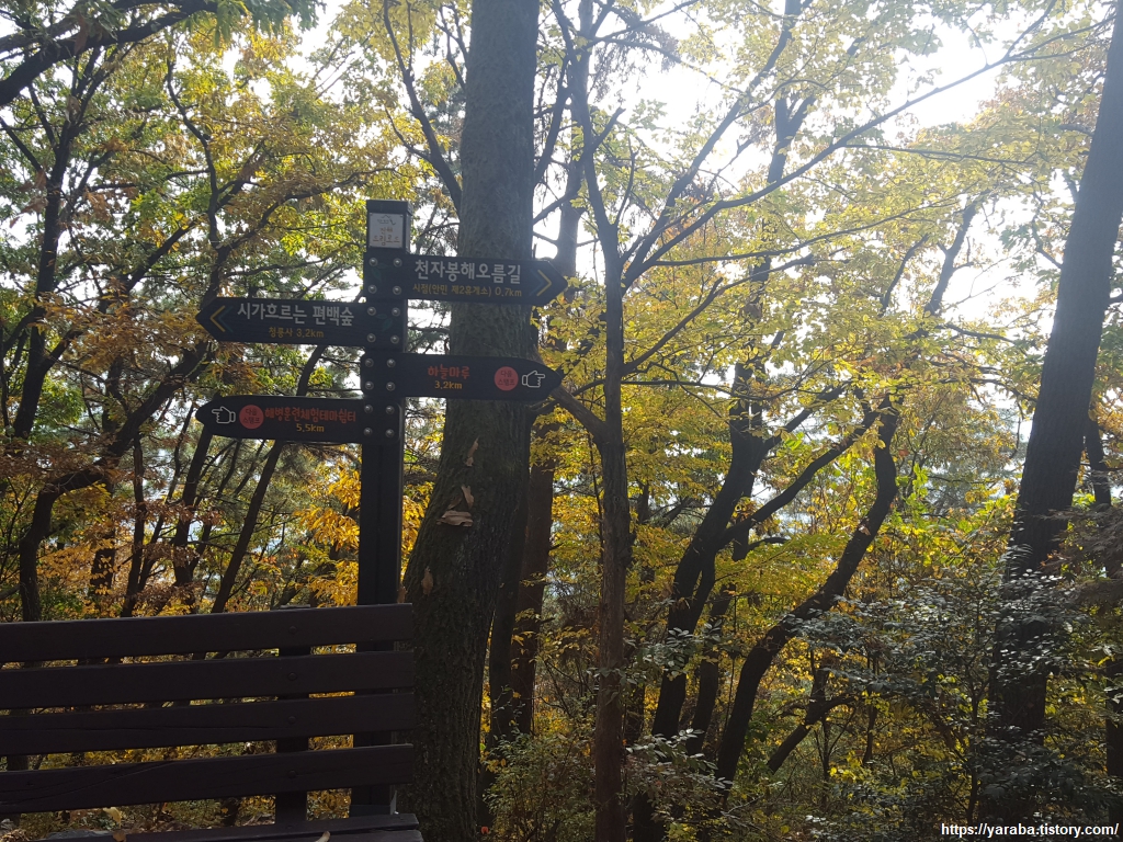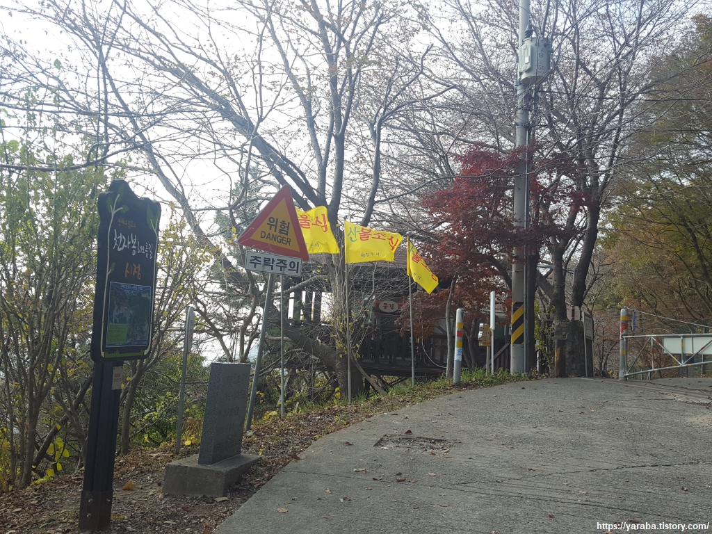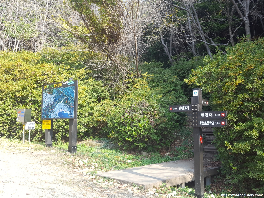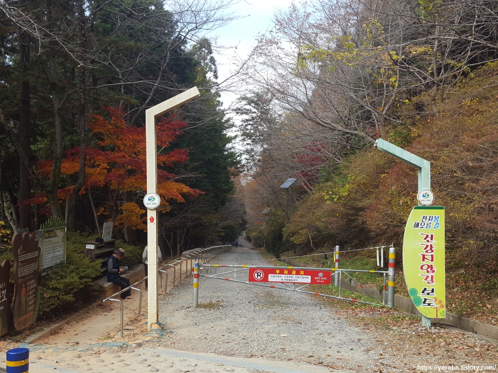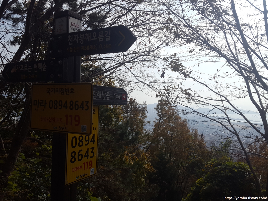 드디어 천자봉 해오름길의 시점에 도착했다. 에코 힐링 센터를 지나 출입구를 지나면 창원시 성산구로 넘어가는 안민 고개에서 내려오는 안민 도로를 만난다.