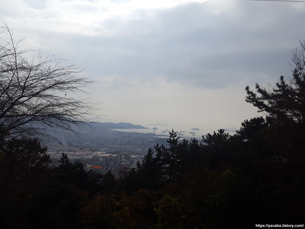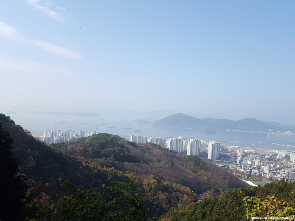 시야 앞으로 막히는 것이 없으니 이제는 진해만 바다와 진해 시내의 전경이 눈에 들어오기 시작한다. 좌측은 8코스를 시작했던 장천동 방면의 모습이다. 진해만 입구에 정박해 있는 큰 배들도 눈에 들어온다. 우측으로는 진해만 안쪽의 모습으로 일제 강점기 일본인들이 진해를 계획도시로 만들면서 공원화했다는 제황산이 정면으로 보이고 있다.